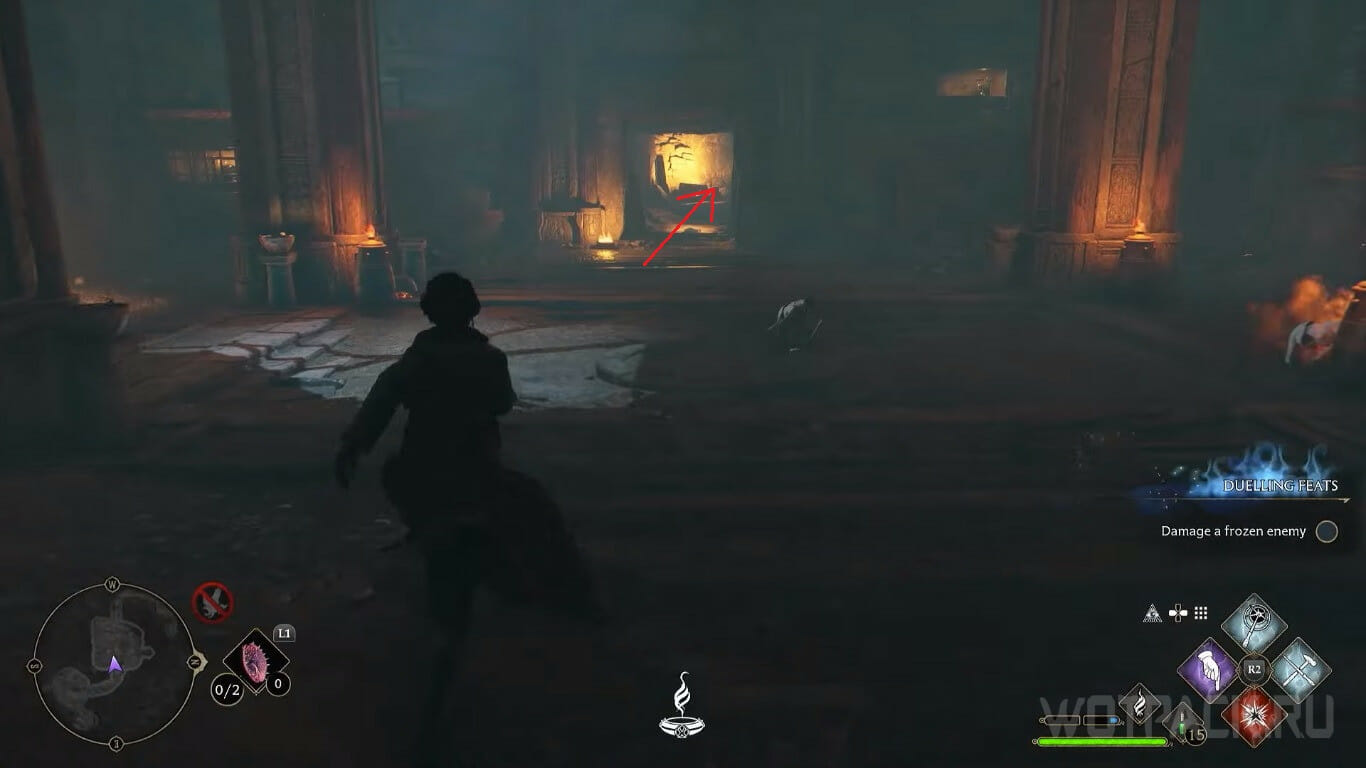 Телепортируйтесь в Башню преподавателей и следуйте через весь коридор и холл к лестнице, ведущей вниз. Как только спуститесь — прыгайте через статую лягушки в другую комнату и залутайте сундук с рукоятью для палочки.