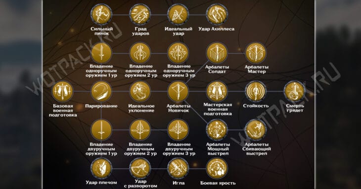 Воин также обучает лишь своих согильдийцев в крепости Ордена и поможет с освоением ветки Арбалетов: Новичок, Солдат, Мастер, Мощный выстрел и Сбивающий выстрел.
