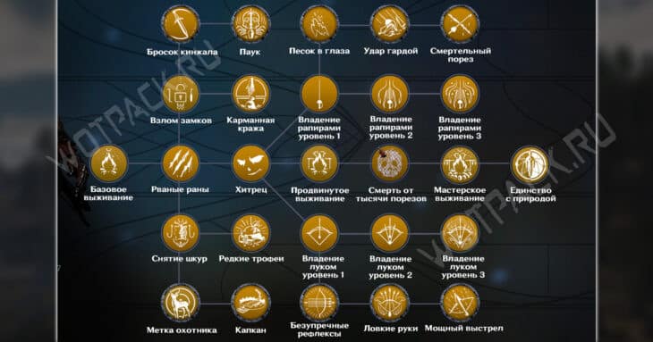 Умения ориентированы на большее взаимодействие с миром и оптимальное использование ресурсов в условиях дикой среды. В направлении открываются боевые искусства для ловкачей — владение луком и рапирами. Изученные навыки не накладываются на оружие в разделе Войны, поэтому при прокачке обратите внимание на характеристики. Базовому выживанию обучит любой из учителей, другие же потребуется активировать у определенных НПС.