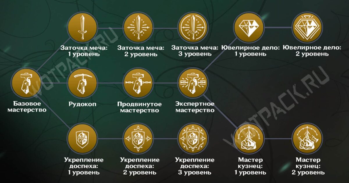 Знания направлены на добычу полезных ископаемых, улучшение доспехов и мечей. На последних этапах развития обучитесь созданию украшений с магическими свойствами и ковке легендарного оружия. Базовым мастерством поможет овладеть любой из учителей направления, остальные же придется открывать в разных уголках Грейшафта.