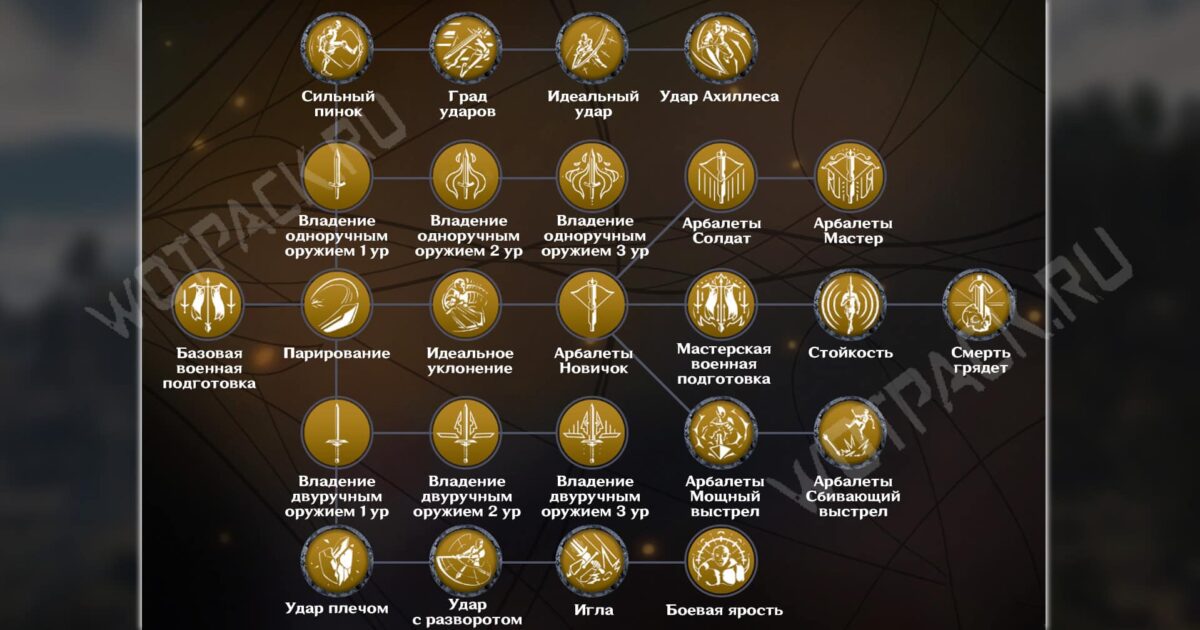 Воин также обучает лишь своих согильдийцев в крепости Ордена и поможет с освоением ветки Арбалетов: Новичок, Солдат, Мастер, Мощный выстрел и Сбивающий выстрел.