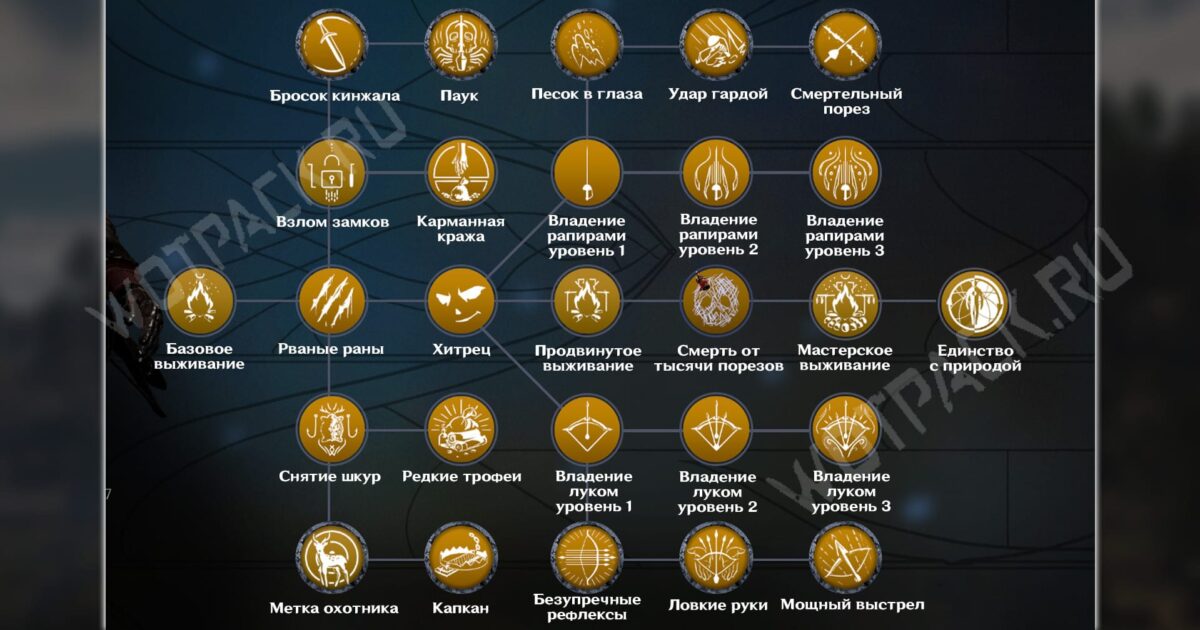 Умения ориентированы на большее взаимодействие с миром и оптимальное использование ресурсов в условиях дикой среды. В направлении открываются боевые искусства для ловкачей — владение луком и рапирами. Изученные навыки не накладываются на оружие в разделе Войны, поэтому при прокачке обратите внимание на характеристики. Базовому выживанию обучит любой из учителей, другие же потребуется активировать у определенных НПС.