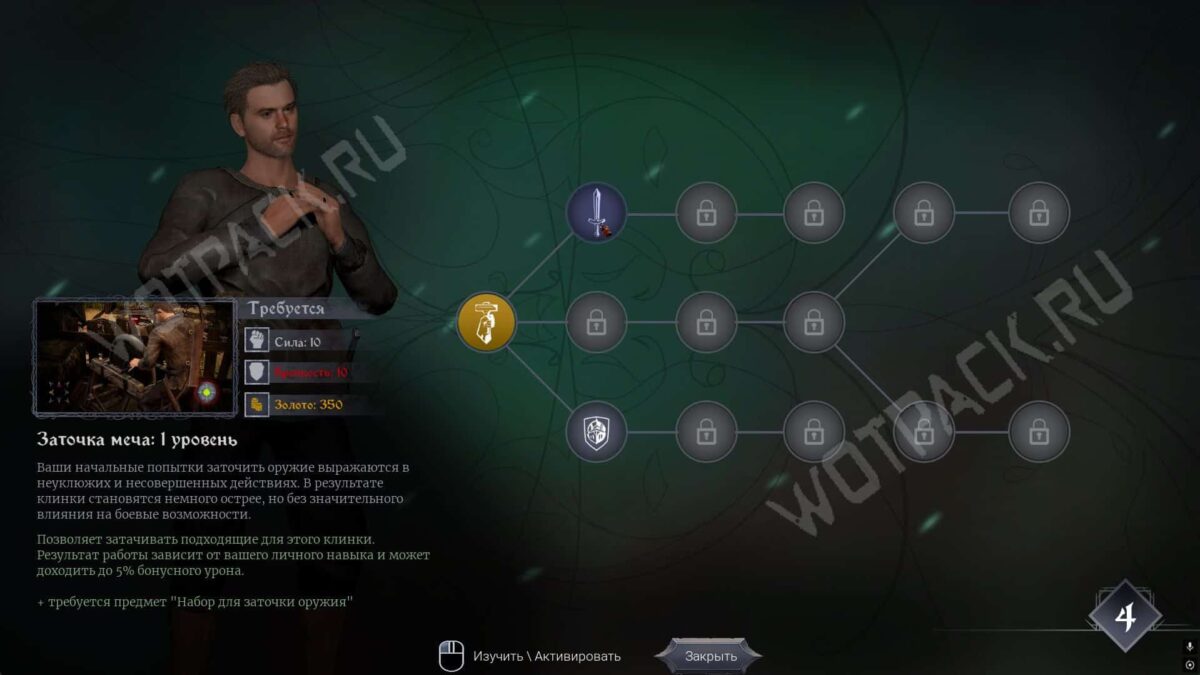 Встретите его в хижине на северо-западе острова и разблокируете начальные умения каждой ветки: Заточку меча первого уровня, Рудокоп и базовое Укрепление доспехов.