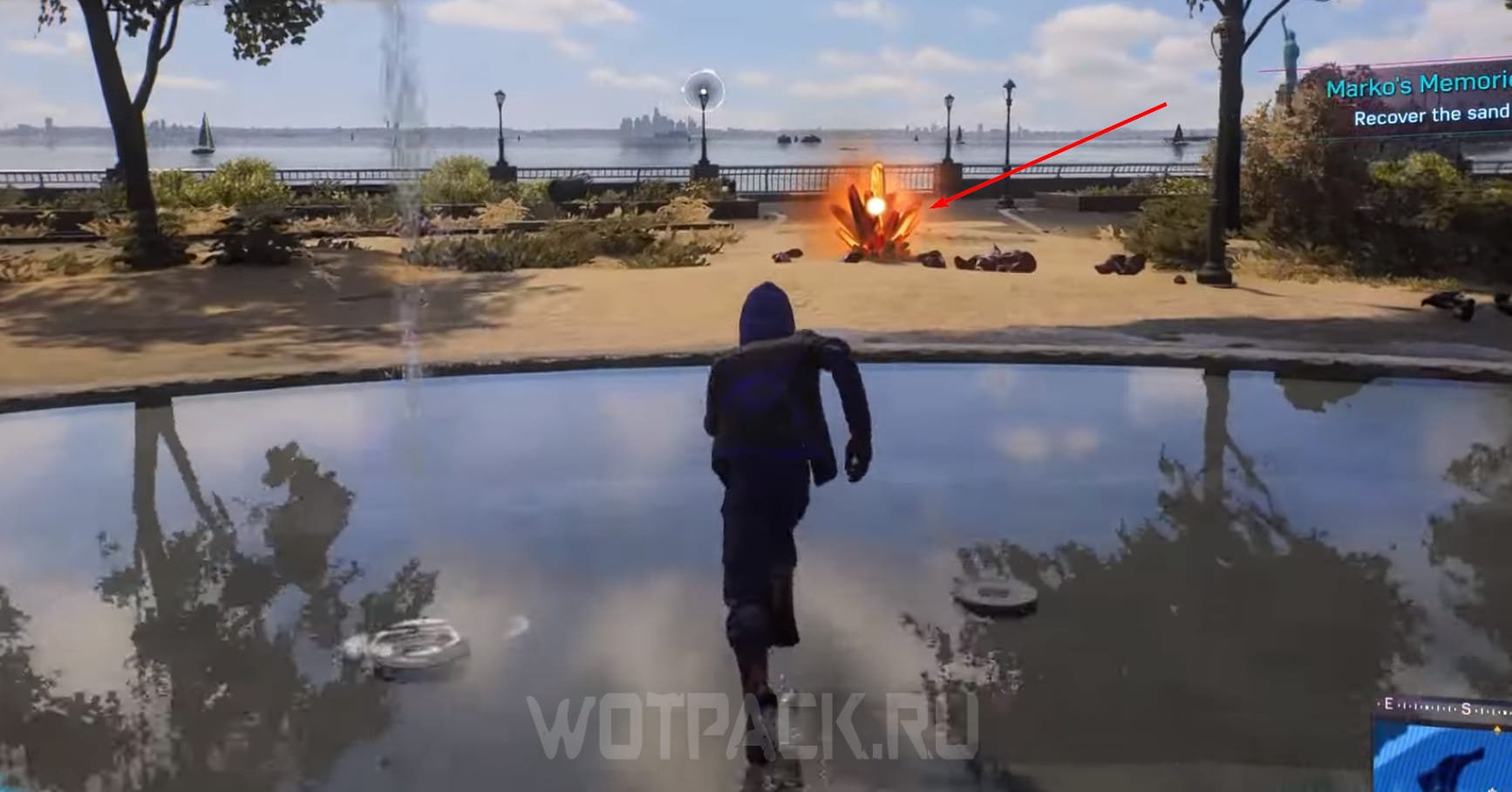 Чтобы отыскать 7-й кристалл, идите в западную часть Гринвича. Между домами увидите засыпанную песком баскетбольную площадку, на ней и находится воспоминание Марко.