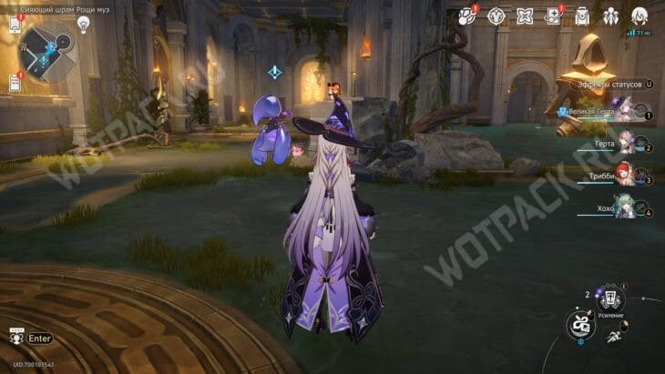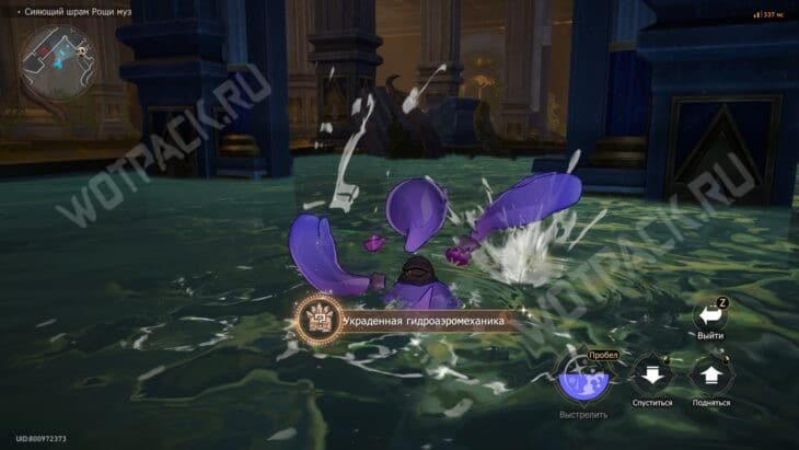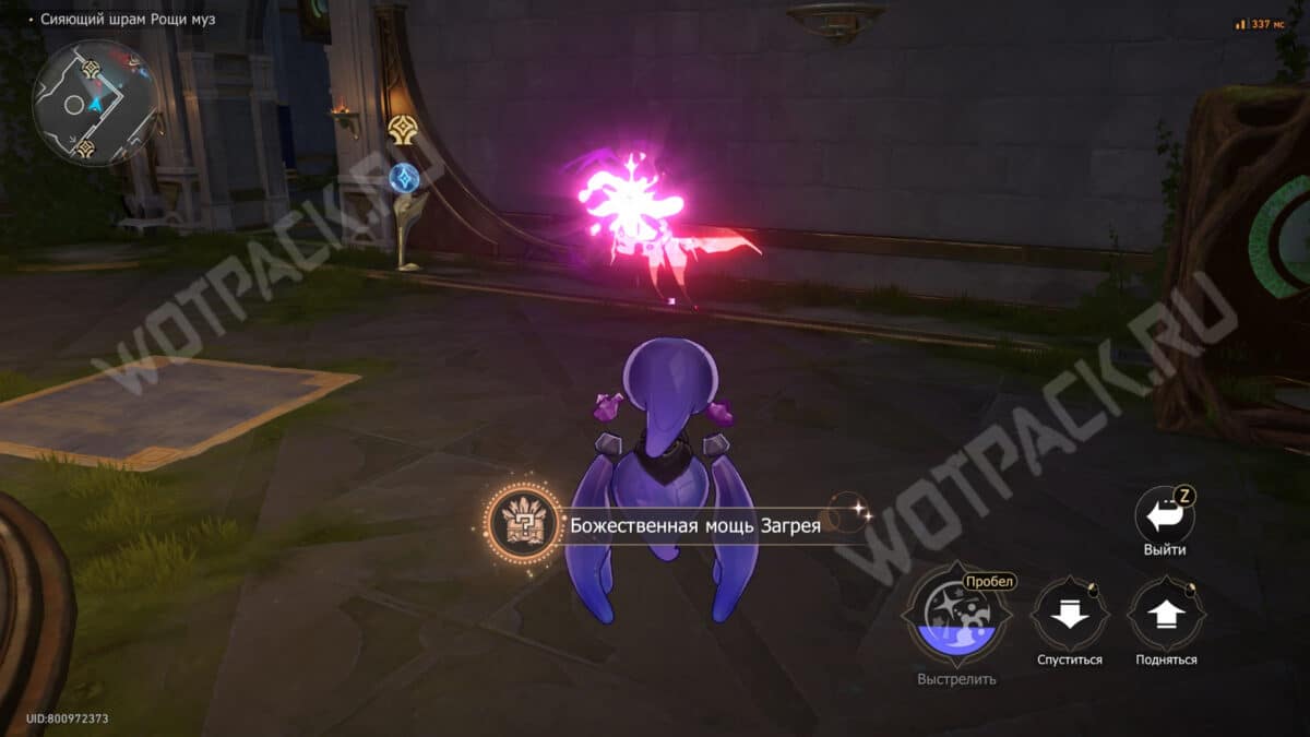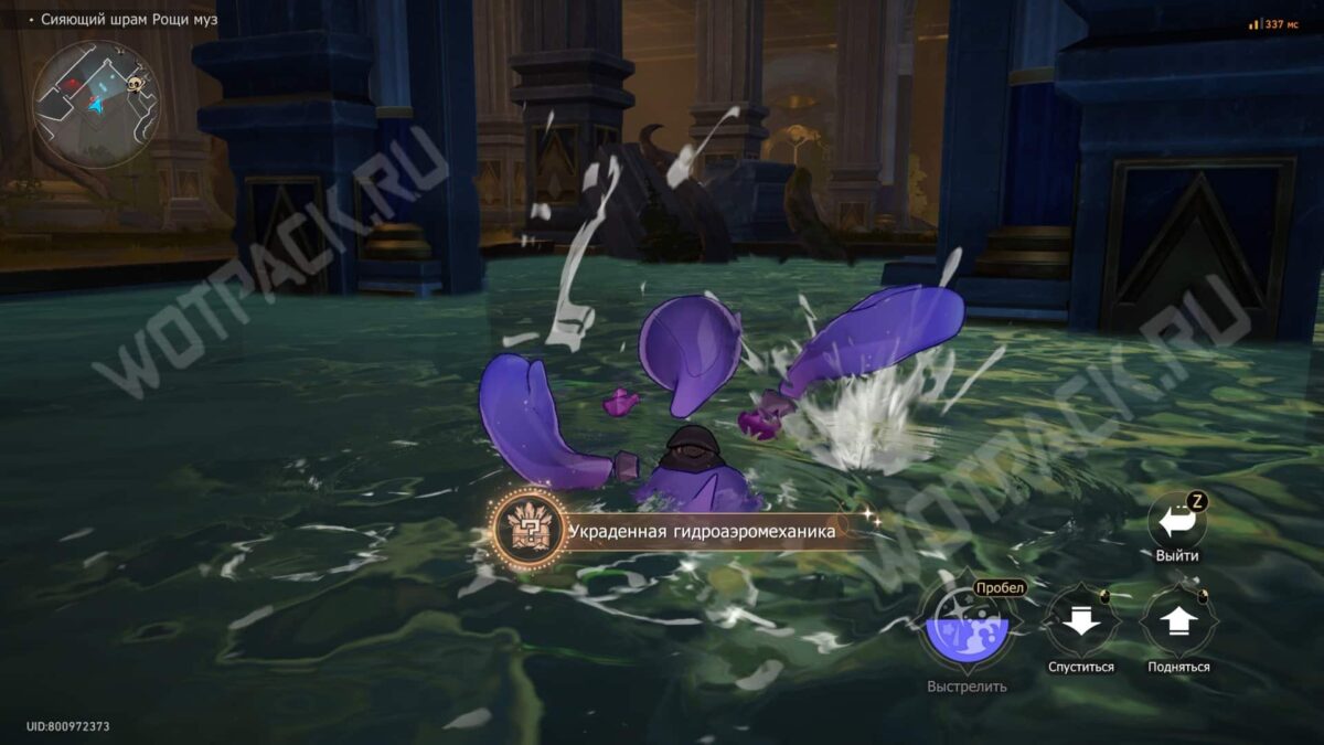 Экипировавшись киотом молитвы для усиления всех воздействий Оронис, переведите весь зал трехмерных купален в ночь при помощи любой киз двух книг чудес и встаньте на предпоследний лист кувшинки. Активируйте молитву на чаше-водопаде и спуститесь до самого дна бассейна на импровизированном подъемнике.