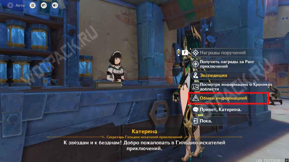 - Начало: Гильдия искателей приключений Нод-Края, в разговоре с Катериной пункт «Обмен информацией».