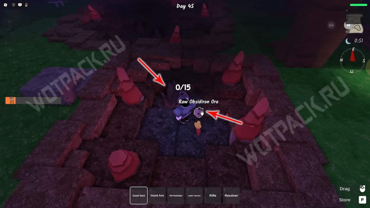 - Собрать необработанную обсидиановую руду и убрать слой грязи с нее, ударив о землю.