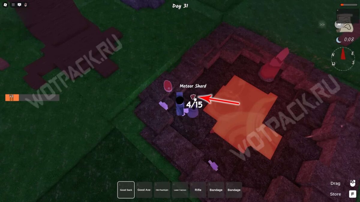 Для того чтобы выполнить условие, разбейте 25 метеоритных кристаллов. Подойдите к точке падания метеора, в яме увидите обугленные пики. Возьмите топор и нанесите удары по красному камню. После разрушения подберите осколки — они понадобятся для следующей ачивки. Двигайтесь от одного образования к другому, пока не уничтожите достаточное количество месторождений.