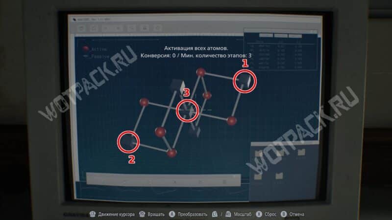 - Реверсивность — в закрытой подсобке лаборатории. Активируйте по порядку три центральных атома, последним — дальний справа.
