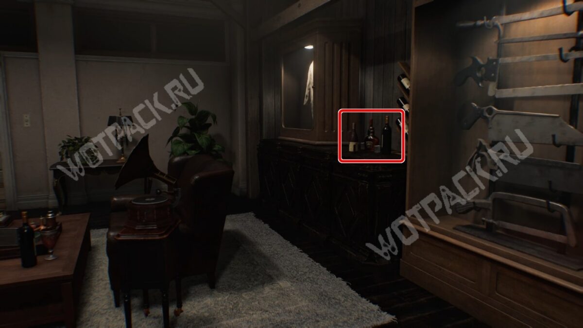 - Осмотрите бутылку вина на мини-баре и поверните её верхнюю часть, чтобы рисунок на этикетке совпал.