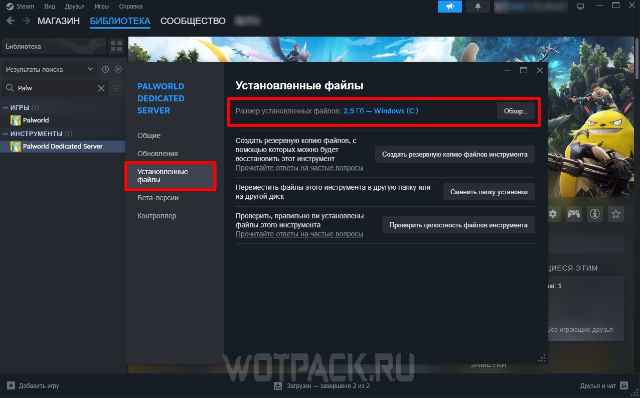 Когда установка успешно завершится, кликните правой кнопкой мыши по инструменту, затем выберите «Свойства». В открывшемся окне перейдите в «Установленные файлы», где нужно нажать «Обзор». Альтернативный вариант – пройти по пути C:Program Files (x86)SteamsteamappscommonPalServer.