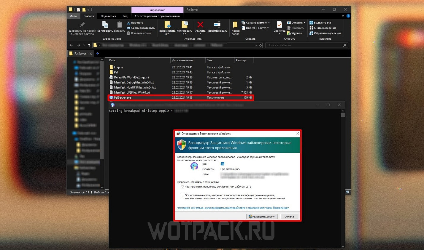 Запустите файл «PalServer.exe», разрешите доступ брандмауэру, если это потребуется. Должно открыться черное окно консоли, как только внутри появится текст – его можно закрывать.
