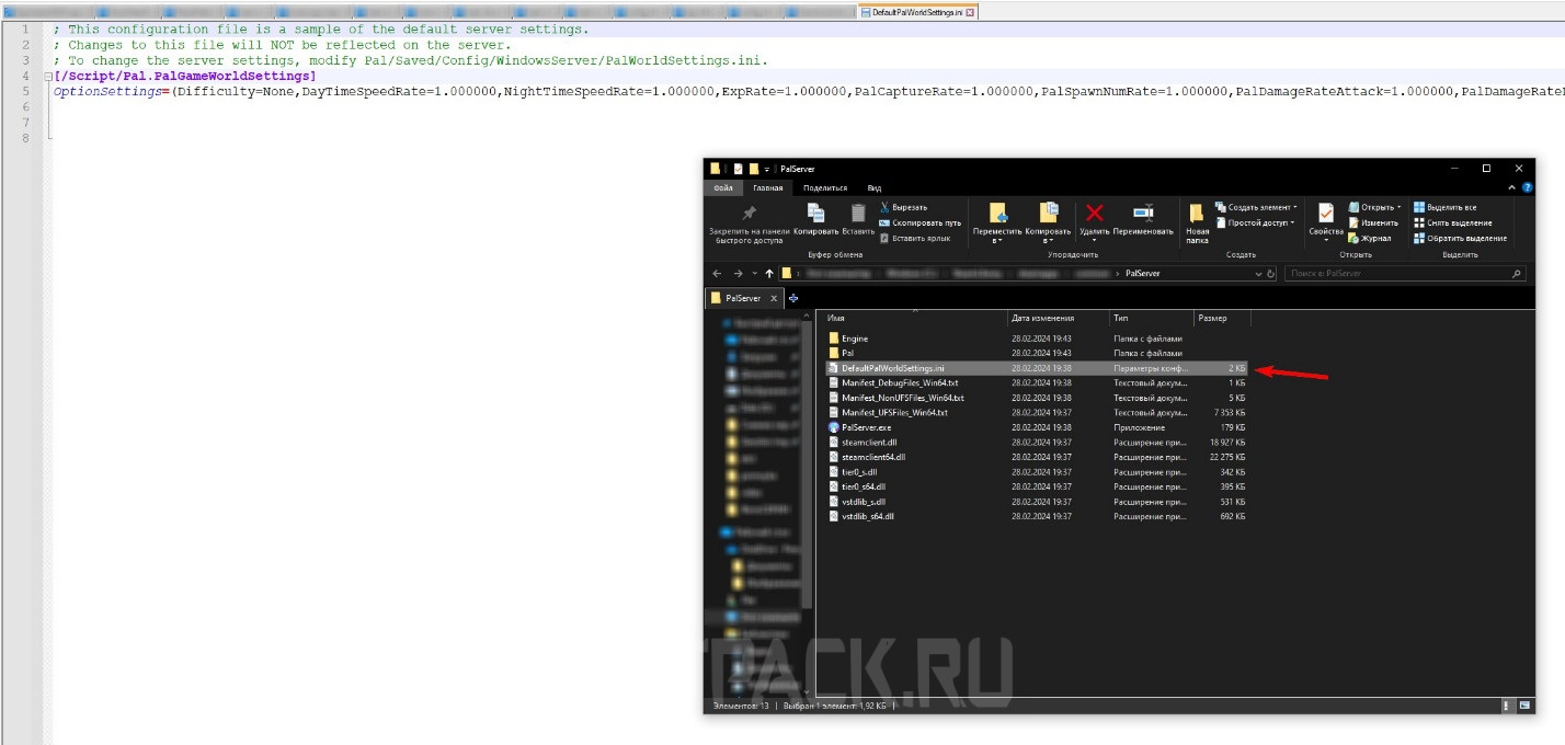 В той же папке найдите файл «DefaultPalWorldSettings.ini», откройте его любым текстовым редактором, но рекомендуется пользоваться NotePad++ для наибольшего удобства. Скопируйте весь текст, находящийся в файле.
