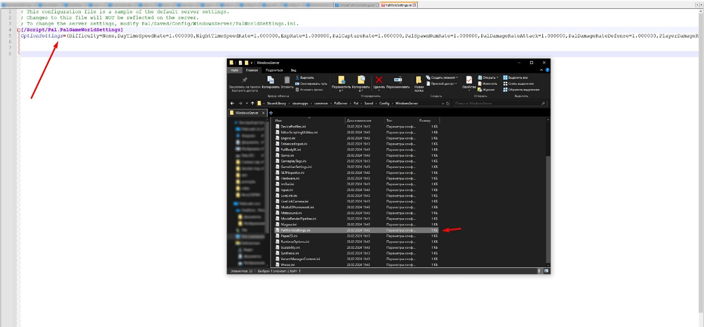 Перейдите в директорию C:Program Files (x86)SteamsteamappscommonPalServerPalSavesConfigWindowsServer. В ней отыщите файл «PalWorldSetting.ini», вновь откройте его при помощи текстового редактора. Вставьте в открывшееся поле весь скопированный ранее текст — это настройки сервера по умолчанию.