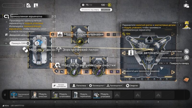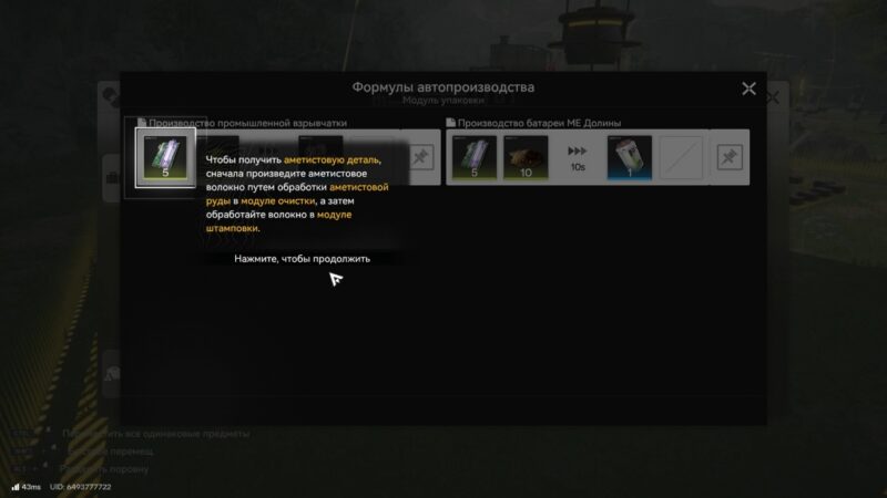 - Модуль упаковки — принимает на входе аметистовые детали и молотый акетин. На выходе получается взрывчатка.
