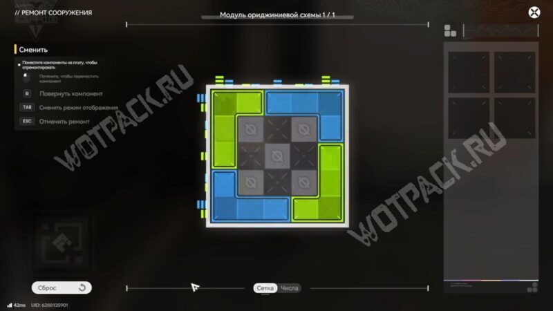 Взаимодействуйте с рычагом. Он сломан, поэтому для починки расставьте модули: два зелёных — в верхний левый и нижний правый углы, два синих — в верхний правый и нижний левый