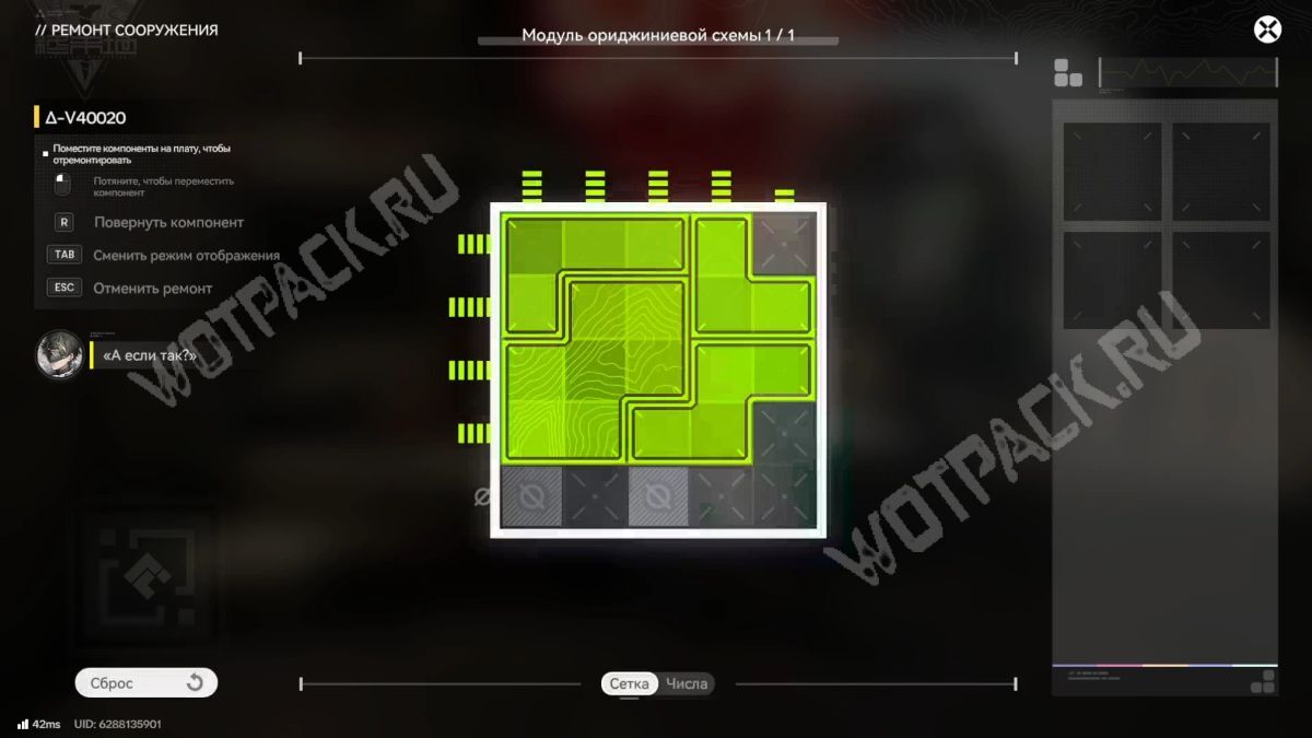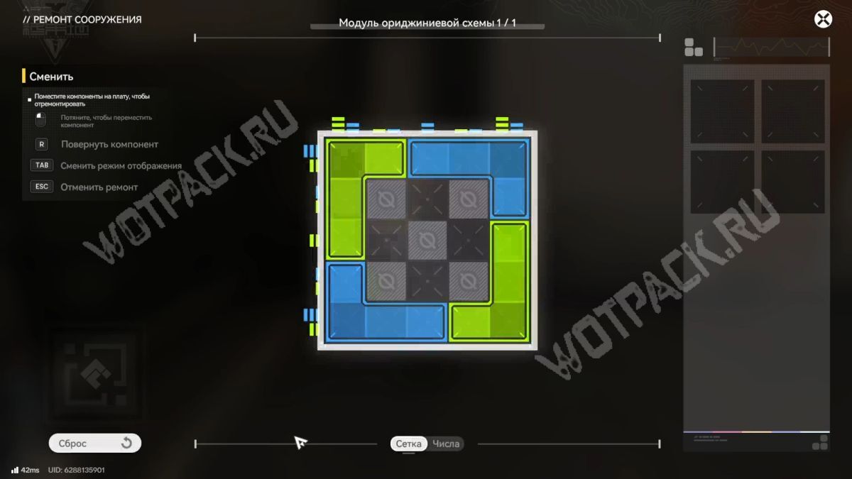 Взаимодействуйте с рычагом. Он сломан, поэтому для починки расставьте модули: два зелёных — в верхний левый и нижний правый углы, два синих — в верхний правый и нижний левый