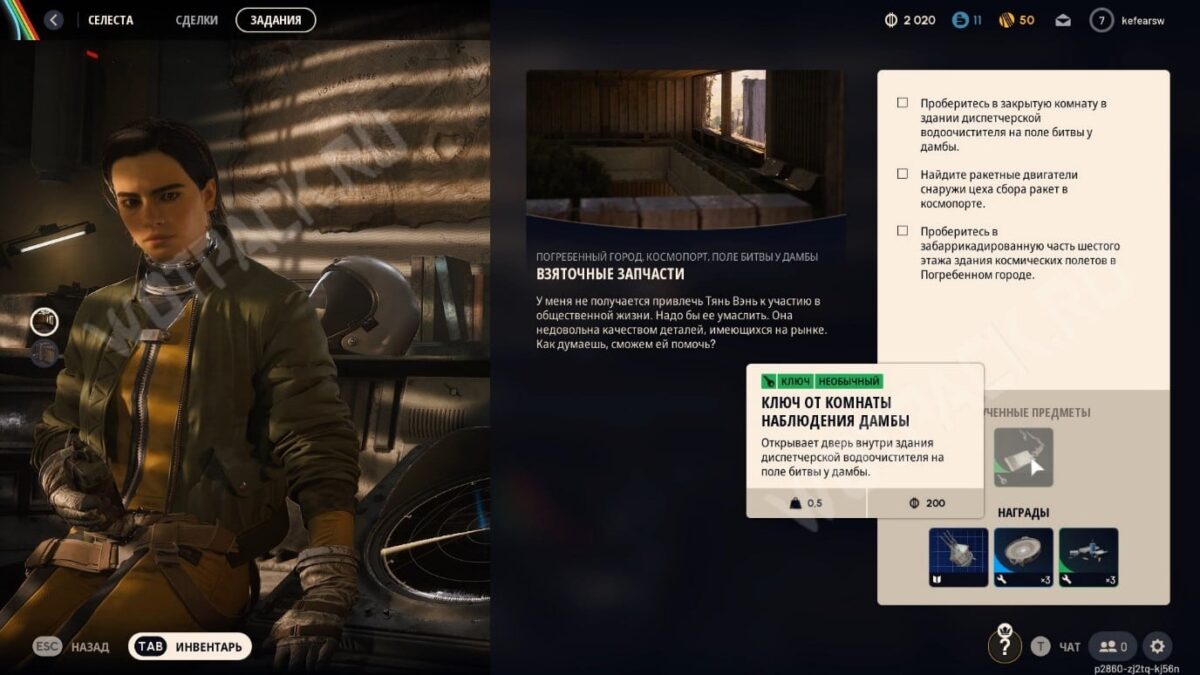 Селеста выдаёт ключ от комнаты наблюдения дамбы при взятии квеста. Положите его в потайной карман, чтобы не потерять в случае неудачи.