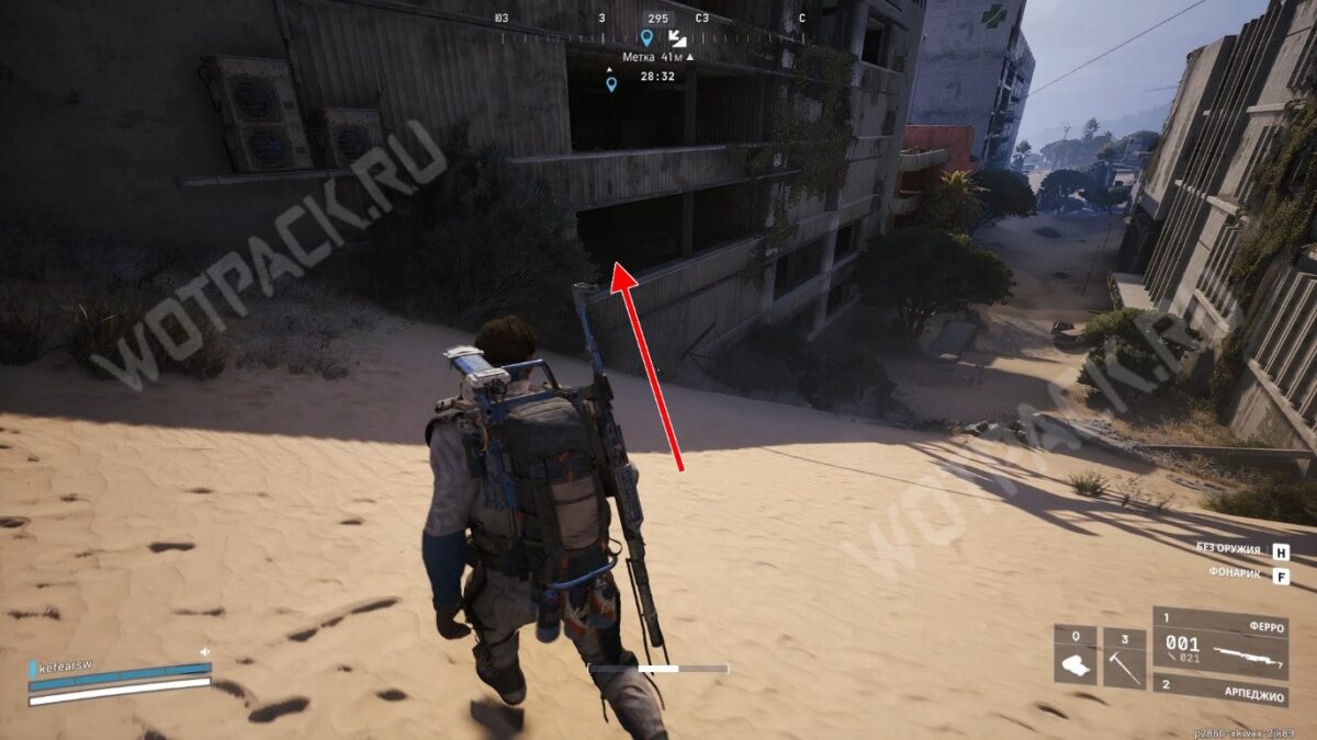 Нужное строение называется «Космопорт», а проще всего забраться в него можно с северо-восточной стороны. Удобный вход — на улице между целевым комплексом и «Галлерией». Дом частично занесён песком, поэтому через окно сразу попадёте на четвёртый этаж.