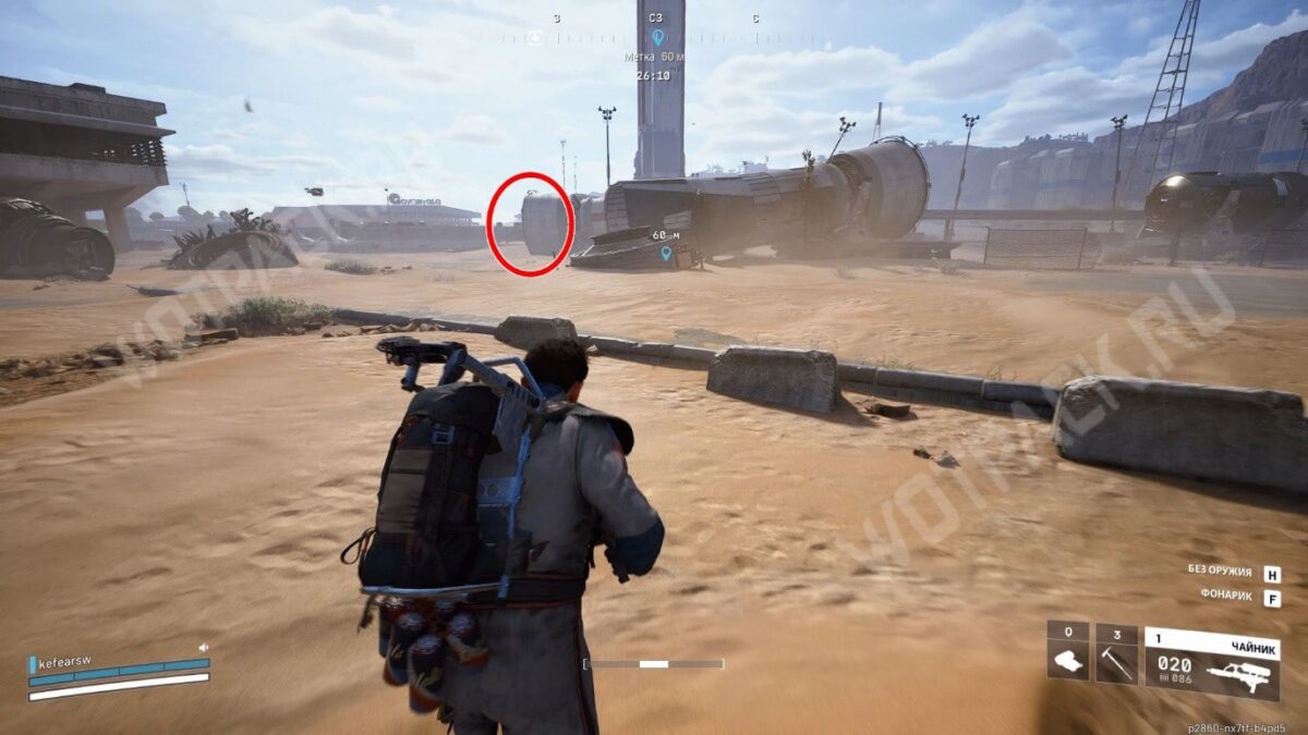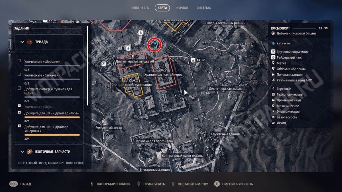 В первую очередь, появившись, определите своё местоположение и установите маркер на пункт назначения. Он находится в центре карты, к юго-западу от цеха сбора ракет, в непосредственной близости от диспетчерской вышки А6 и хранилища контейнеров.