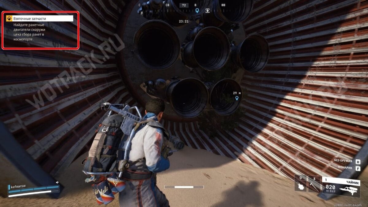 Ракетные двигатели огромны и выделяются на рельефе карты. Для выполнения квеста к ним нужно подойти. Доберитесь до указанных координат и подойдите к соплам ракеты — задание обновится.