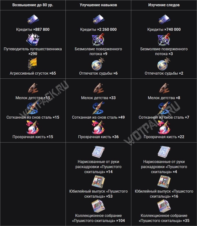 - нарисованные от руки раскадровки «Пушистого скитальца» (×18), юбилейный выпуск «Пушистого скитальца» (×69) и коллекционное собрание «Пушистого скитальца» (×139) — ресурсы для прокачки следов из Чашелиста (багровый).