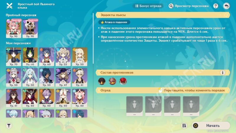 В простоте исполнения и соблюдения условия на активацию навыка перед атакой в падении Вареса выигрывает у любого героя. При желании можете попробовать команду с танцором Ка Мином и адептом Сяо, но с ними результат будет хуже.