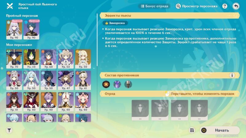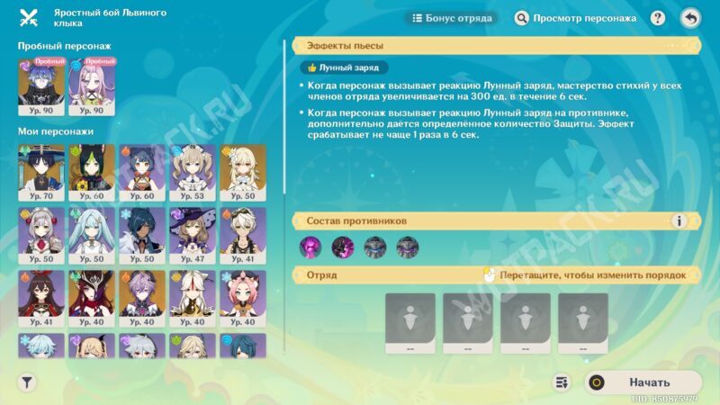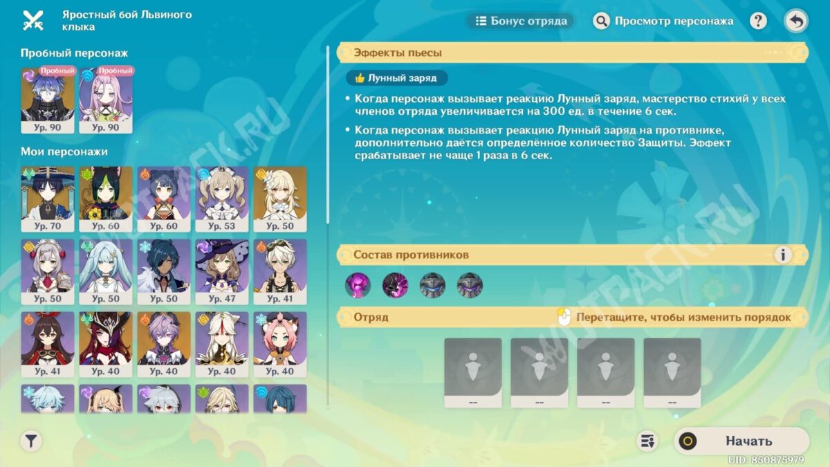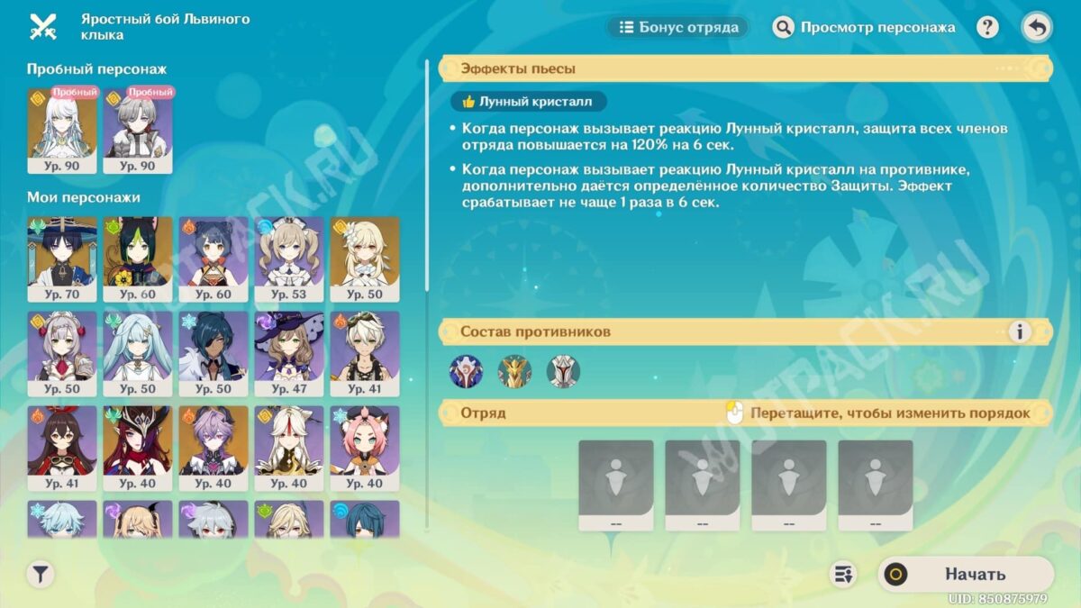 Сражение с бонусом к Лунному кристаллу и защите всех членов группы. Для теста предоставлены мейн-дд от Лунного кристалла адепт Цзы Бай и её сигнатурный саппорт светоносец Иллуги.