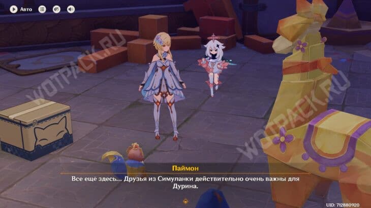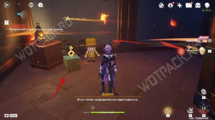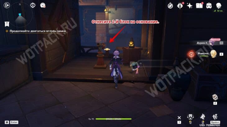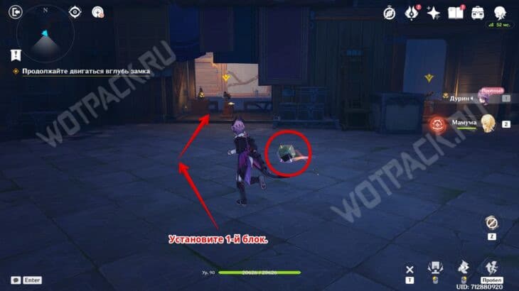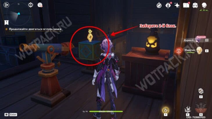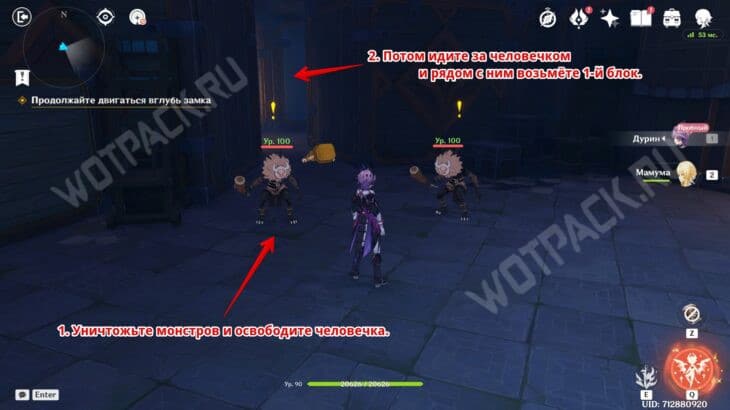 Сначала спасите деревянного человечка, уничтожив двух хиличурлов. Следуйте за ним по узкому коридору и подберите первый блок особым умением на «Т». Если потеряете его, то вернитесь в то же самое место.
