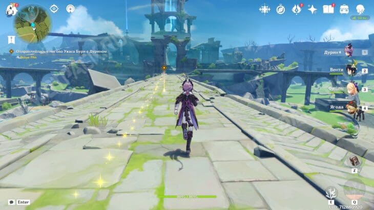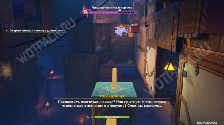 Когда продолжите путь, Паймон заметит: «Смотрите, внизу кто-то попал в ловушку». Рассказчица намекнёт на развилку: «Продолжить двигаться к башне? Или прыгнуть в тень стены, чтобы спасти попавшего в ловушку? Сложная дилемма… Дорога к башне…».