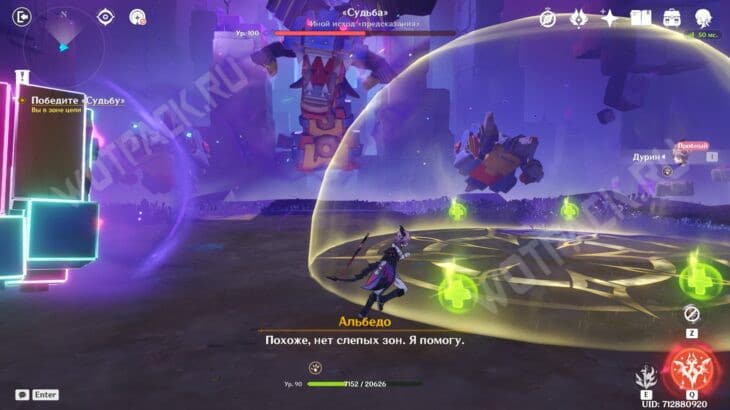 - Когда расправитесь с мелкими врагами, предстоит уклоняться от кубов. Как только между ними не окажется свободного пространства, Альбедо возведёт защитный купол — встаньте под него.