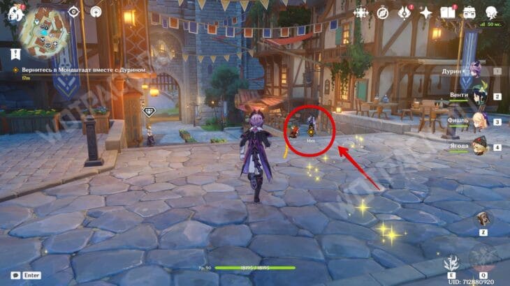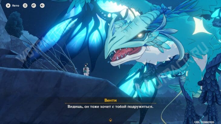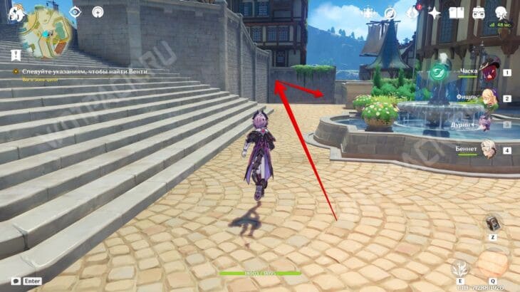 Венти стоит на северо-восточной части городской стены и смотрит вдаль. Приблизьтесь к нему, зайдя за фонарь на углу дороги, после чего начнётся кат-сцена.