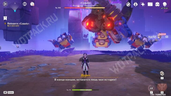 На арене с боссом «Иной исход предсказания» подбирайте зелёные сферы HP и при необходимости используйте еду для лечения. Если здоровье всё же упадёт практически до минимума, то благодаря вмешательству друзей оно должно восстановиться. Сражение от лица мечника Дурина пройдёт в следующем порядке: