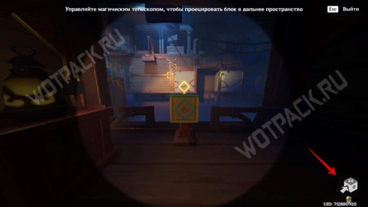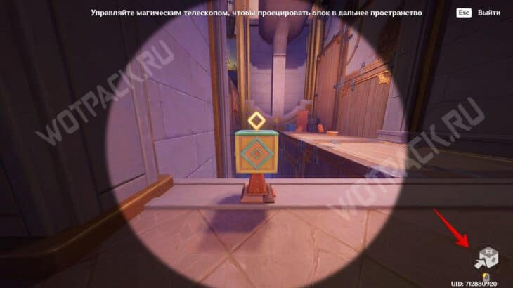 - Разместив кубик, управляйте магическим телескопом, чтобы проецировать блок в дальнее пространство. Для этого снова используйте ЛКМ или единственный доступный навык.