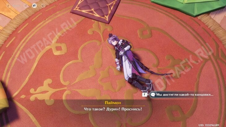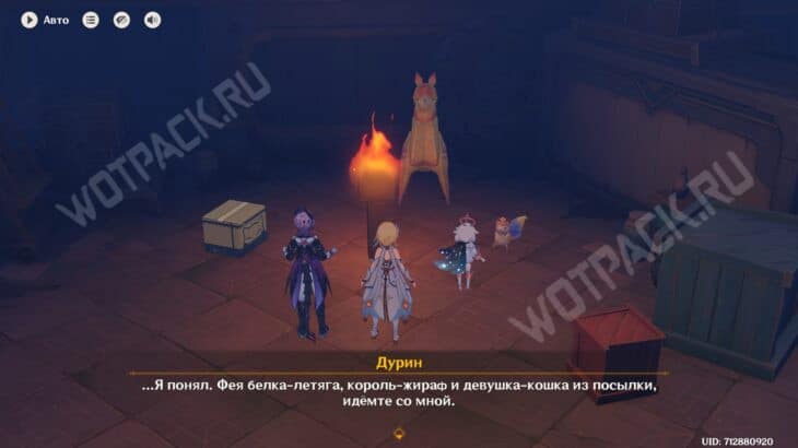 Встретьтесь с Дурином неподалёку от Катерины в компании мечника Кэйи, маленького рыцаря Кли и принцессы Фишль. Застав друзей за игрой в Священный призыв семерых, подслушаете диалог на тему благосклонности божества и алкоголя.