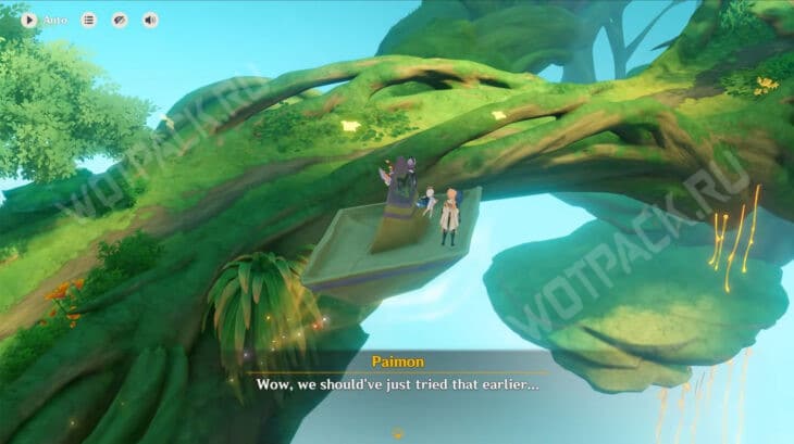 По первоначальному плану отправляйтесь туда, откуда дует ветер — «в Мондштадт». По пути сможете свернуть с тропы к бумажному кораблю и посмотреть дополнительную сцену. Мальчик предположит, что такое судно могло бы полететь и вне Симуланки, поскольку в реальном мире существует безграничное количество возможностей. Взаимодействуйте с кораблём ещё раз, чтобы добраться на нём до нужного места.