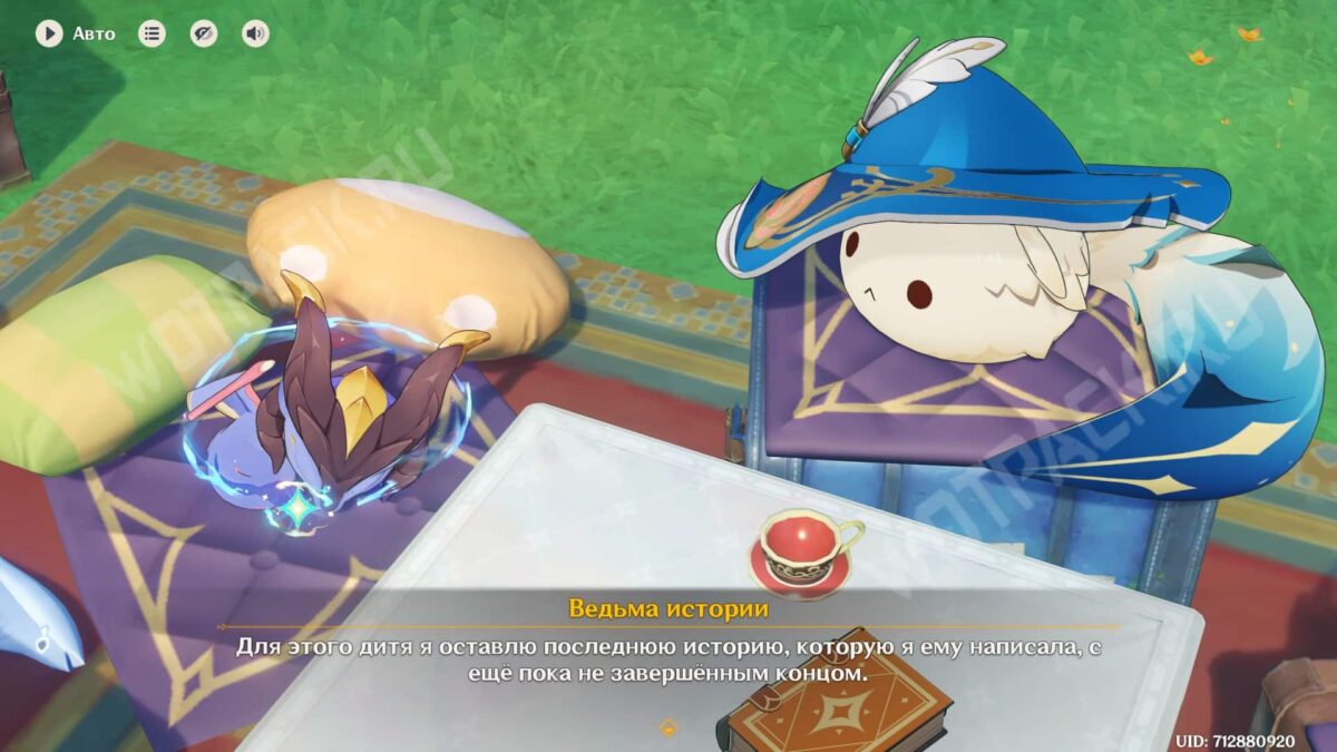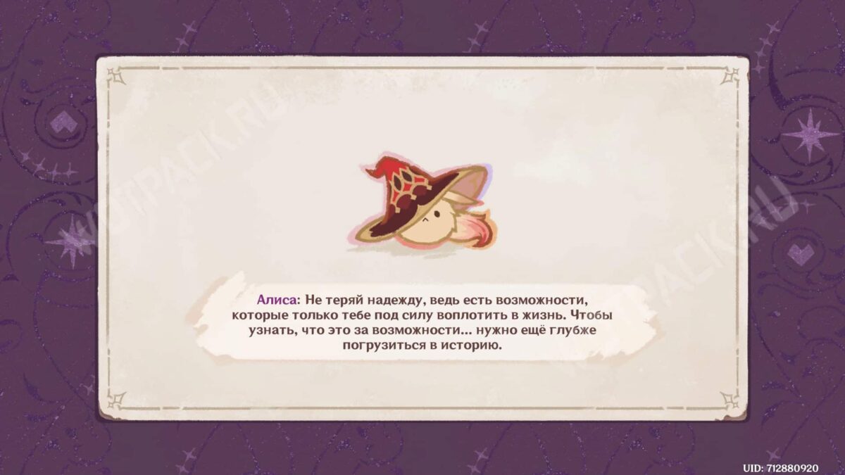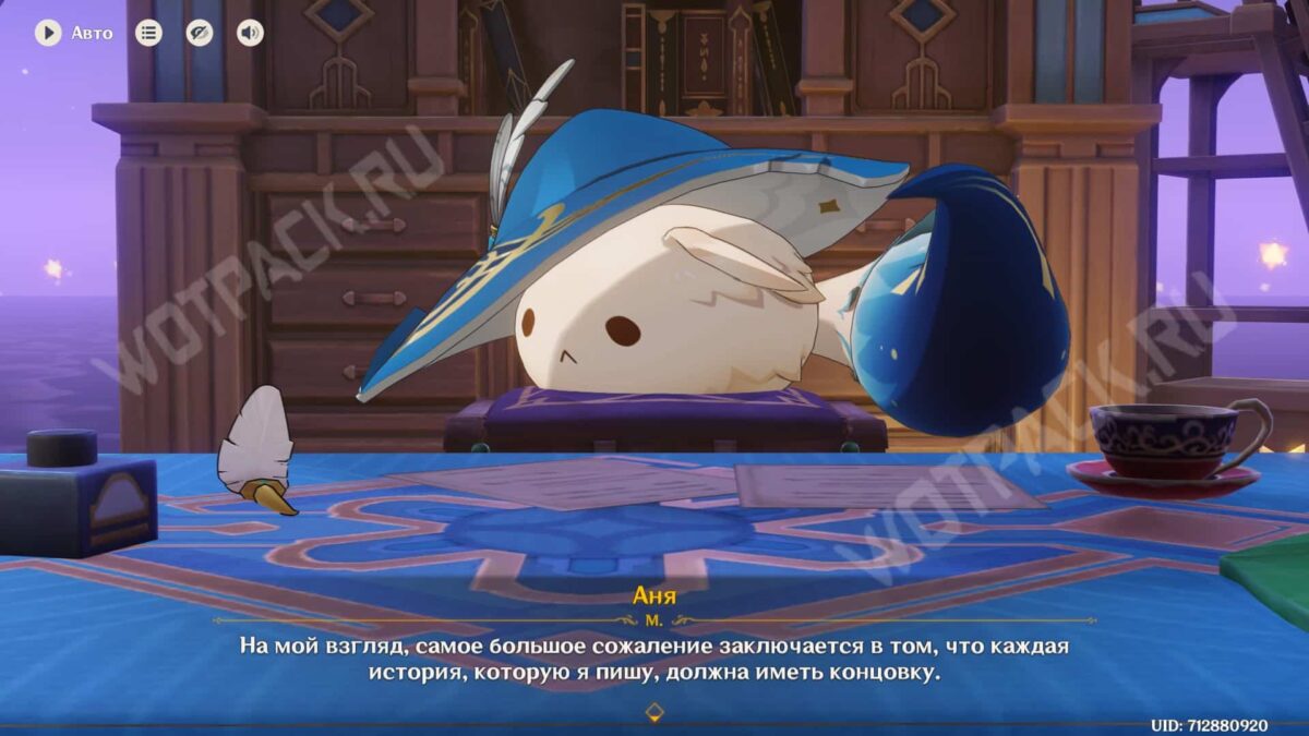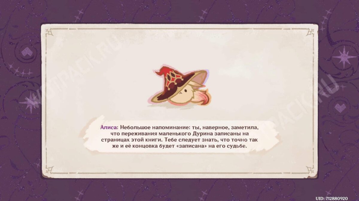 Пока не совершите телепортацию в другую точку, сможете поговорить с Алисой и Венти. Первая объяснит, что Путешественнику передали экземпляр произведения, а бард поделится впечатлением о счастливом конце.