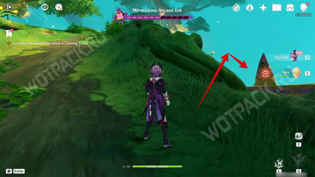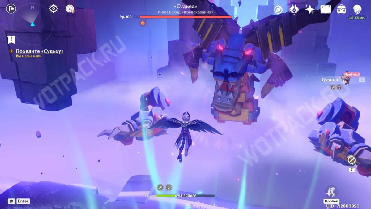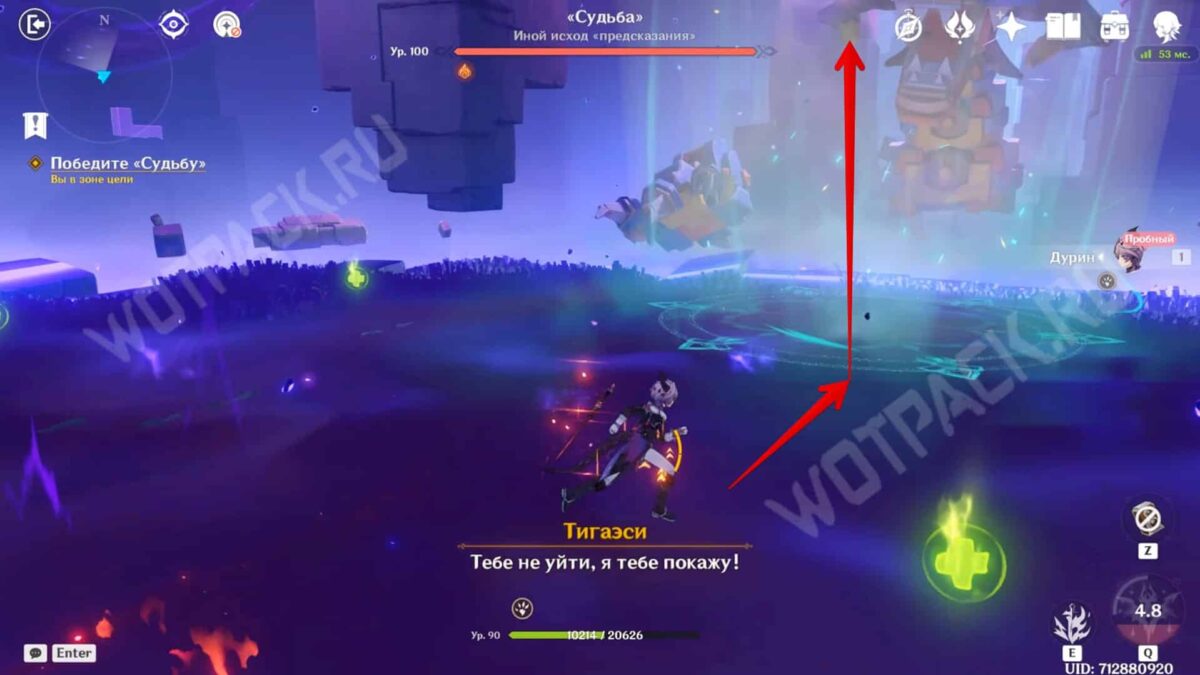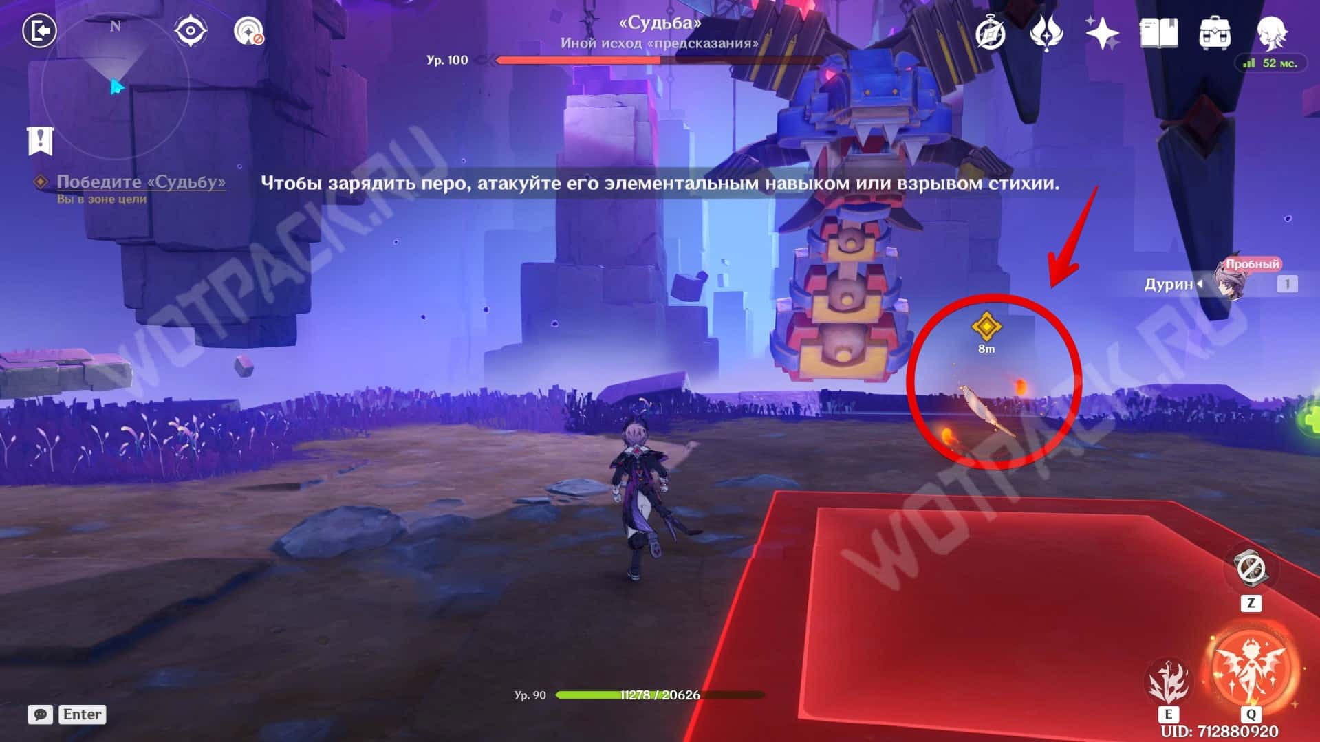 - Чтобы зарядить перо, атакуйте его элементальным навыком или взрывом стихии — оно собьёт половину здоровья со шкалы босса.