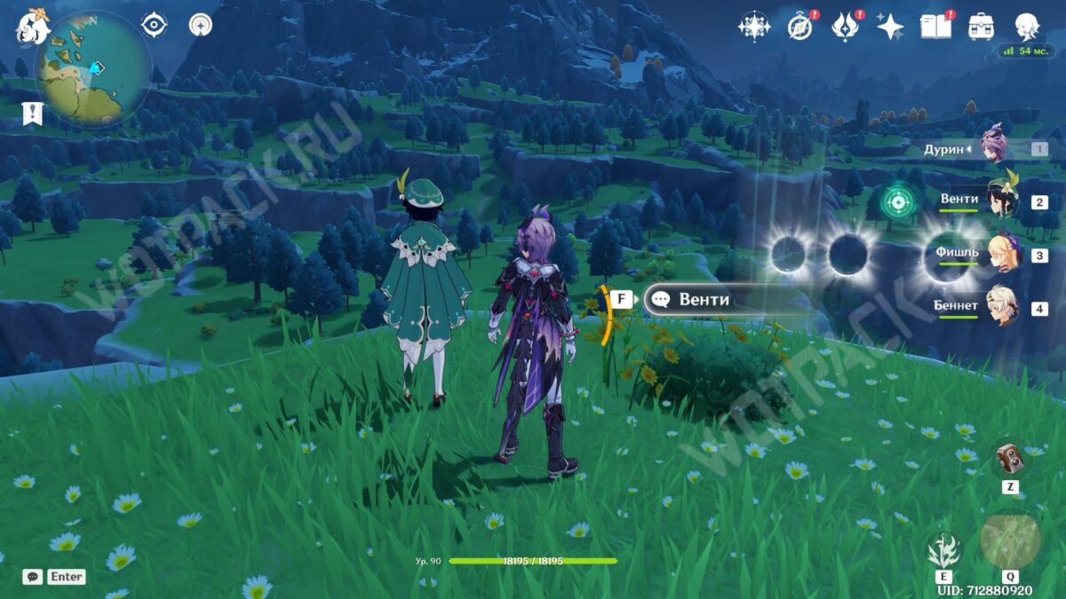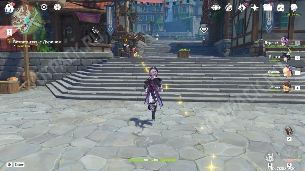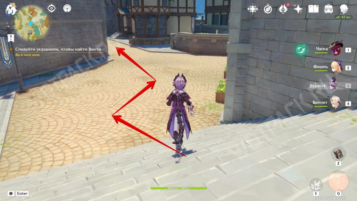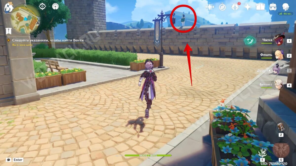 Венти стоит на северо-восточной части городской стены и смотрит вдаль. Приблизьтесь к нему, зайдя за фонарь на углу дороги, после чего начнётся кат-сцена.