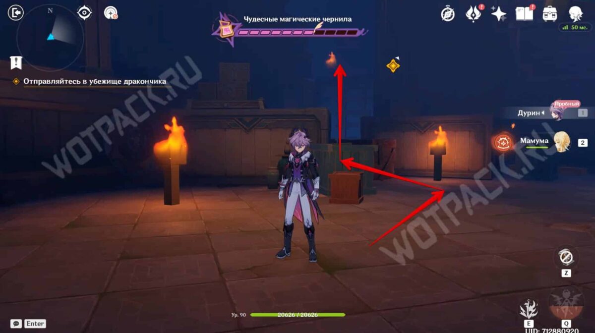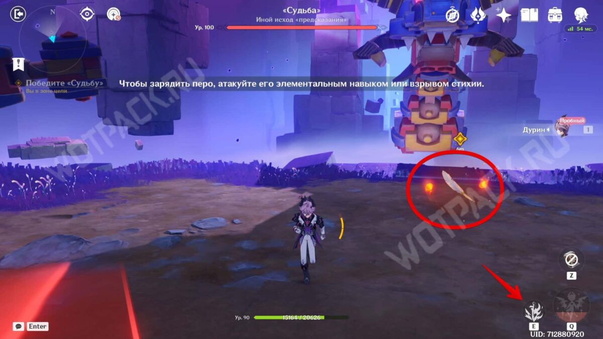 - Снова напитайте перо Пиро элементом — оно полетит в босса и добьёт его.