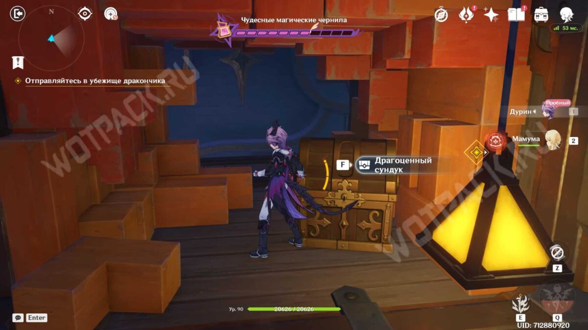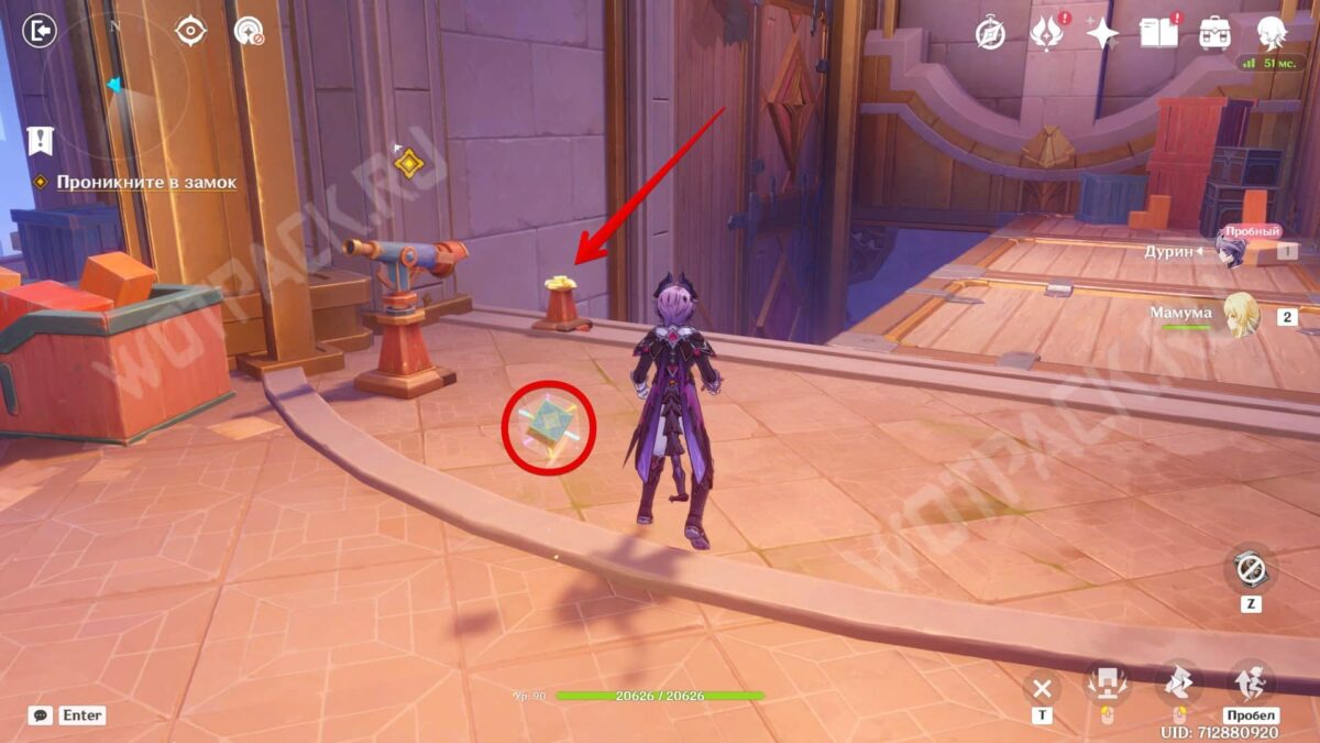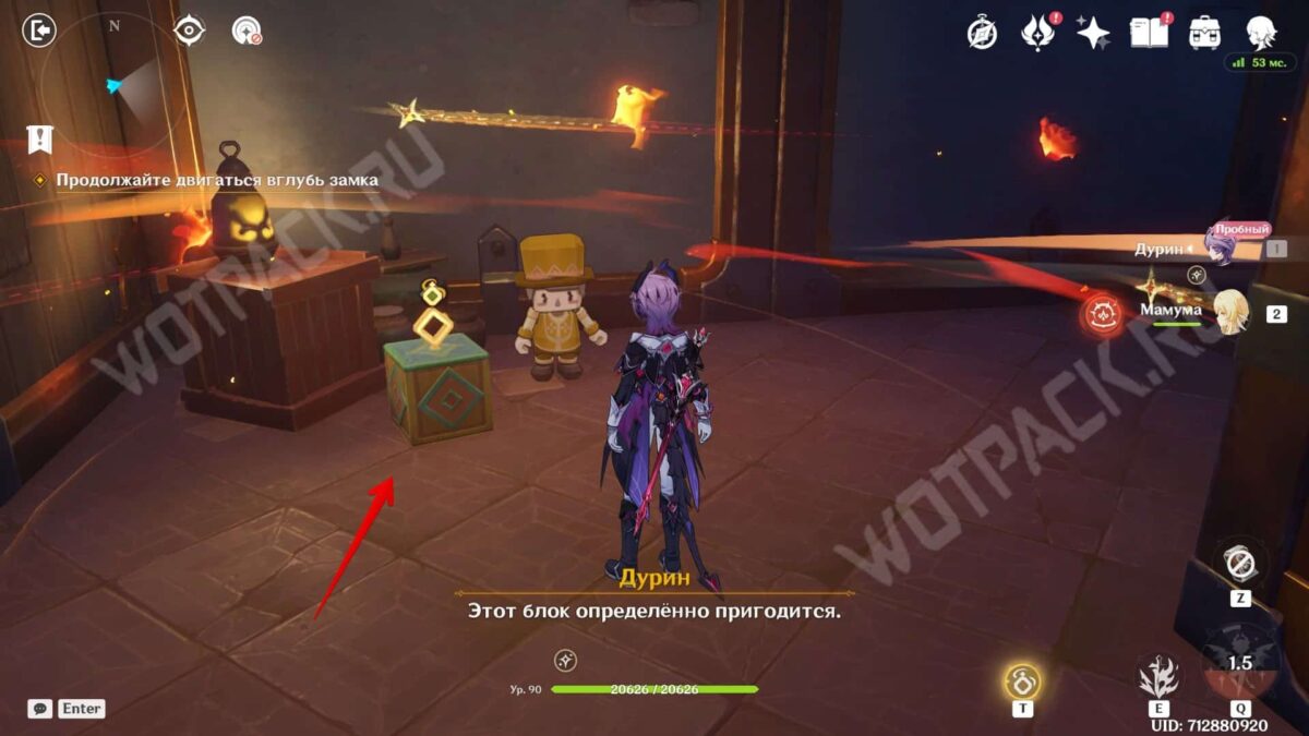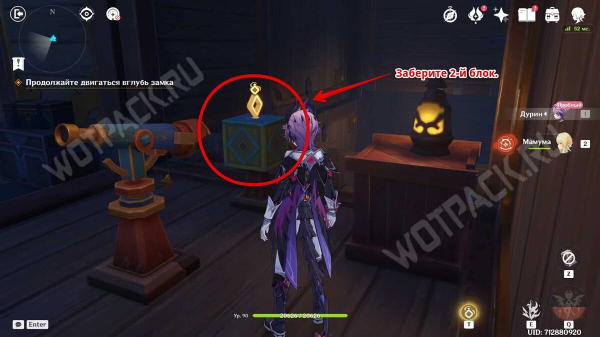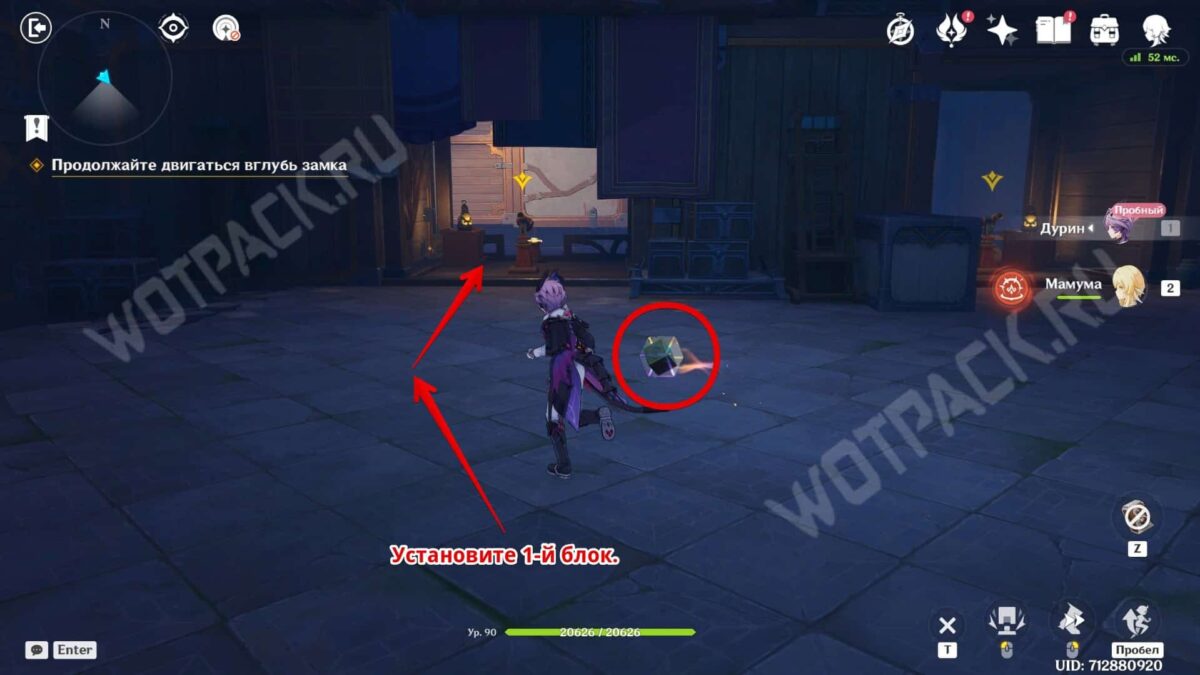 Сначала спасите деревянного человечка, уничтожив двух хиличурлов. Следуйте за ним по узкому коридору и подберите первый блок особым умением на «Т». Если потеряете его, то вернитесь в то же самое место.