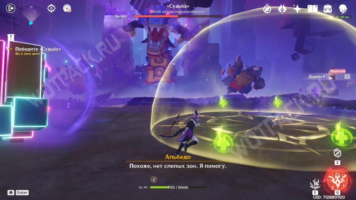 - Когда расправитесь с мелкими врагами, предстоит уклоняться от кубов. Как только между ними не окажется свободного пространства, Альбедо возведёт защитный купол — встаньте под него.