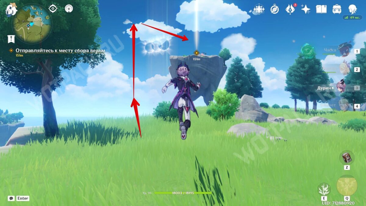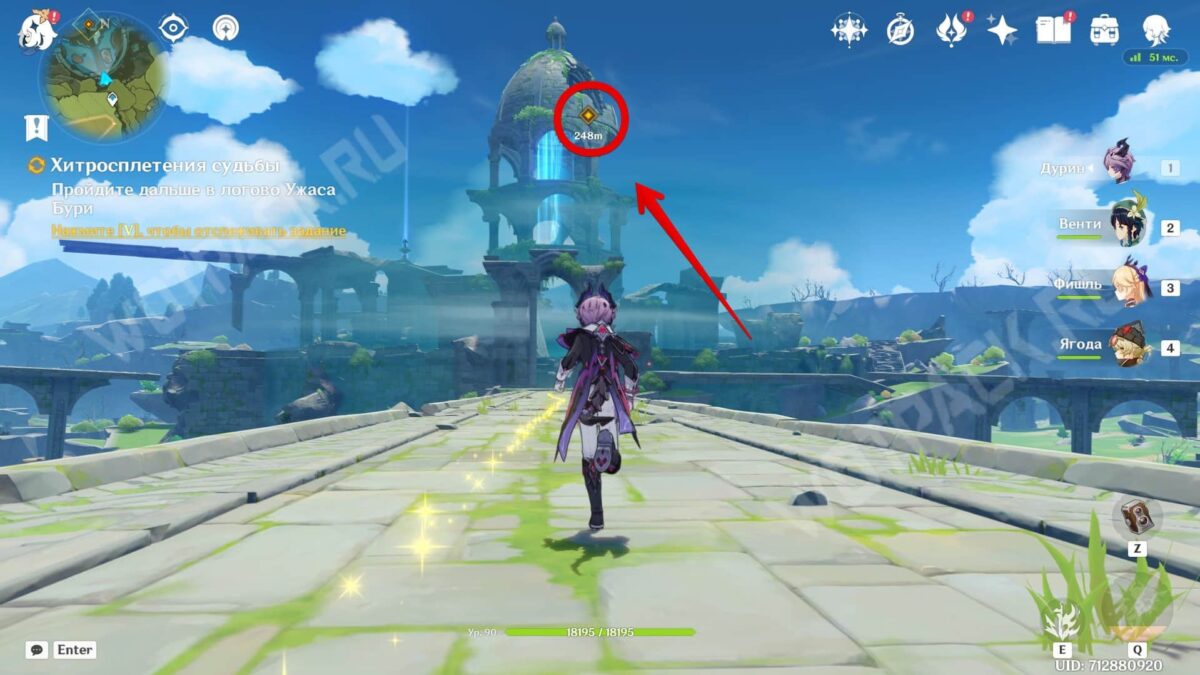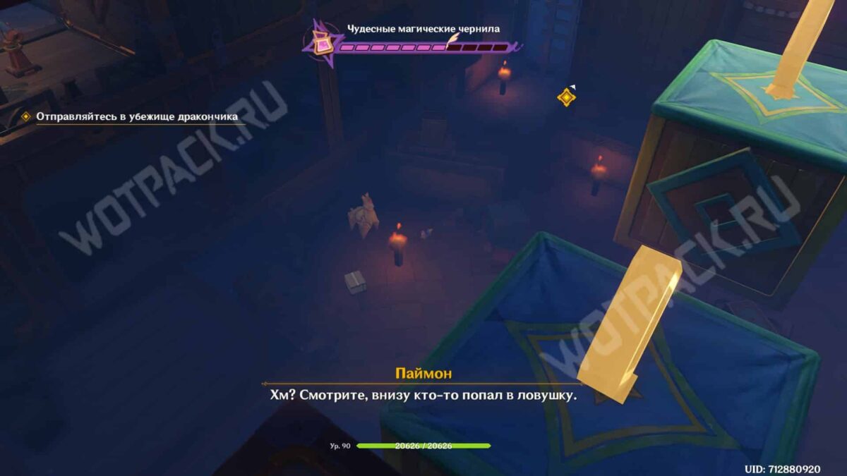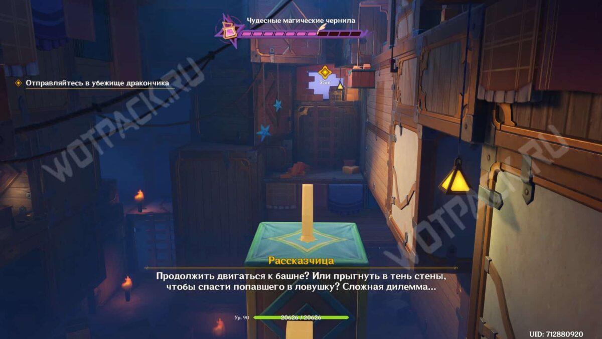 Когда продолжите путь, Паймон заметит: «Смотрите, внизу кто-то попал в ловушку». Рассказчица намекнёт на развилку: «Продолжить двигаться к башне? Или прыгнуть в тень стены, чтобы спасти попавшего в ловушку? Сложная дилемма… Дорога к башне…».