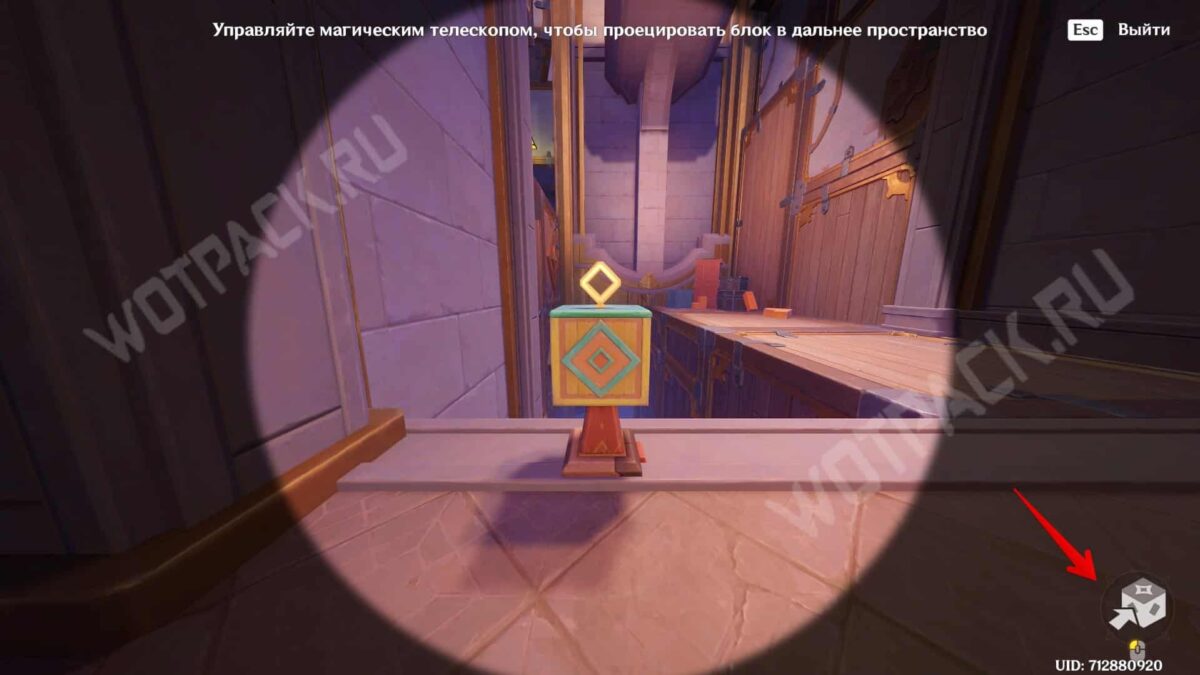 - Разместив кубик, управляйте магическим телескопом, чтобы проецировать блок в дальнее пространство. Для этого снова используйте ЛКМ или единственный доступный навык.