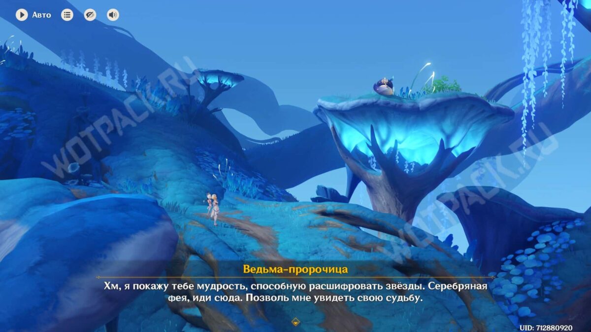 Обратитесь к наблюдающей за звёздами пророчице, чтобы попросить её посмотреть своё будущее. Вместо гадания для Путешественника она посмотрит на судьбу «Серебряной феи» Паймон, но ничего не расскажет и погрузится в глубокие раздумья.