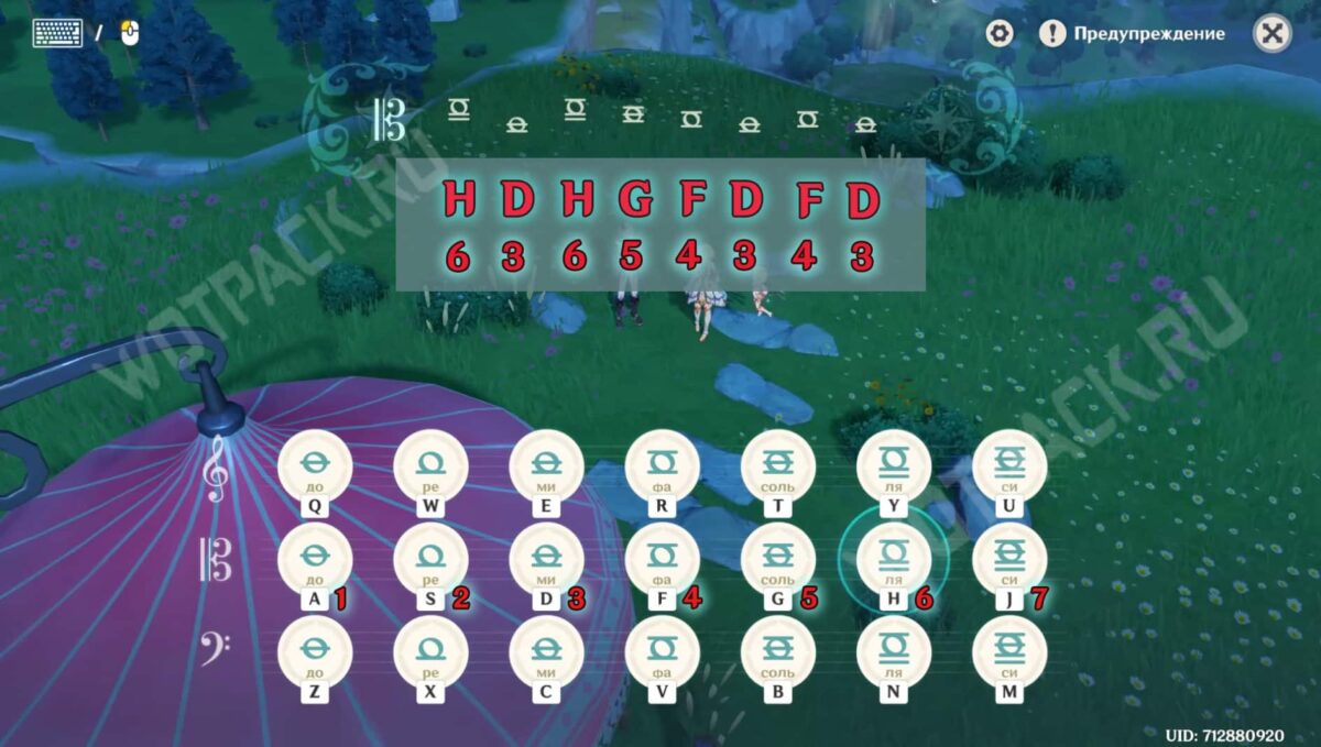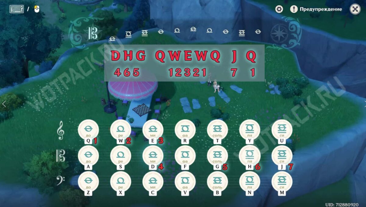 - D-H-G на центральном ключе (ми-ля-соль), Q-W-E-W-Q на первом (до-ре-ми-ре-до), потом J (си) снова на втором и Q (до) на верхнем.