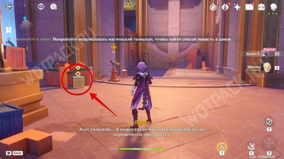 Бегите к стоящему рядом ведьминскому телескопу и на ЛКМ разместите предмет на постаменте.