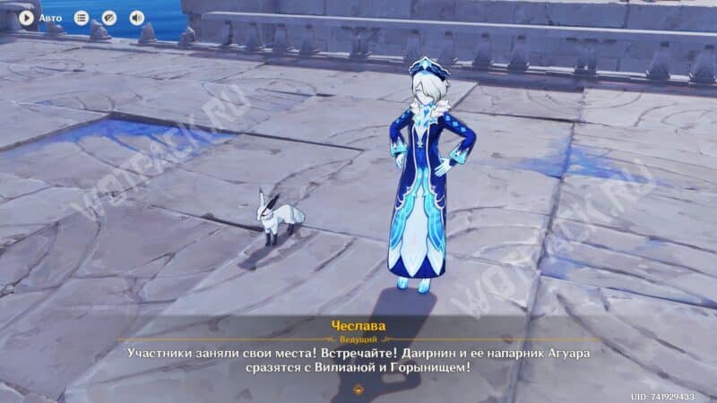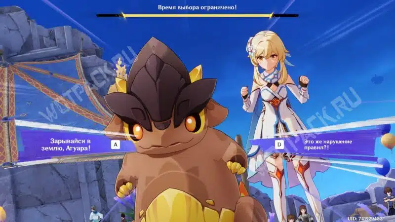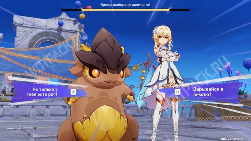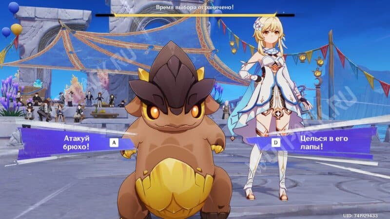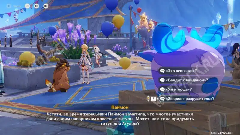 Пройдите жеребьёвку для участия во втором этапе на выбывание и перед выходом на арену ответьте на вопрос Паймон о титуле для тепетлизаврика. Выбрать можно любой среди доступных вариантов: