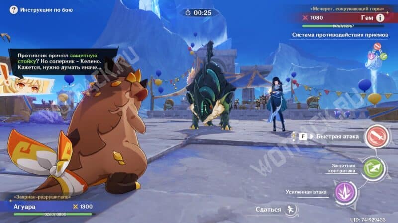 Первые три хода предсказать действия оппонентки будет нельзя. Ее атаки случайны, поэтому выбирать можно любые приемы. Следом мечерог активирует сверхспособность, успешно отразить которую можно выбрав вариант «Зарывайся в землю!».