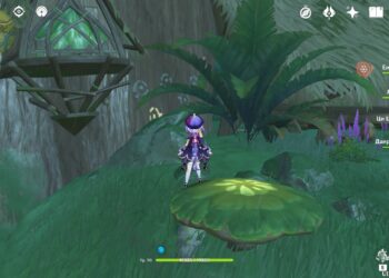 От того же телепорта сможете добраться до четвертой точки. Обойдите дерево, пока не увидите пружинистый гриб. Зарядите его Электро атакой, чтобы забраться повыше.